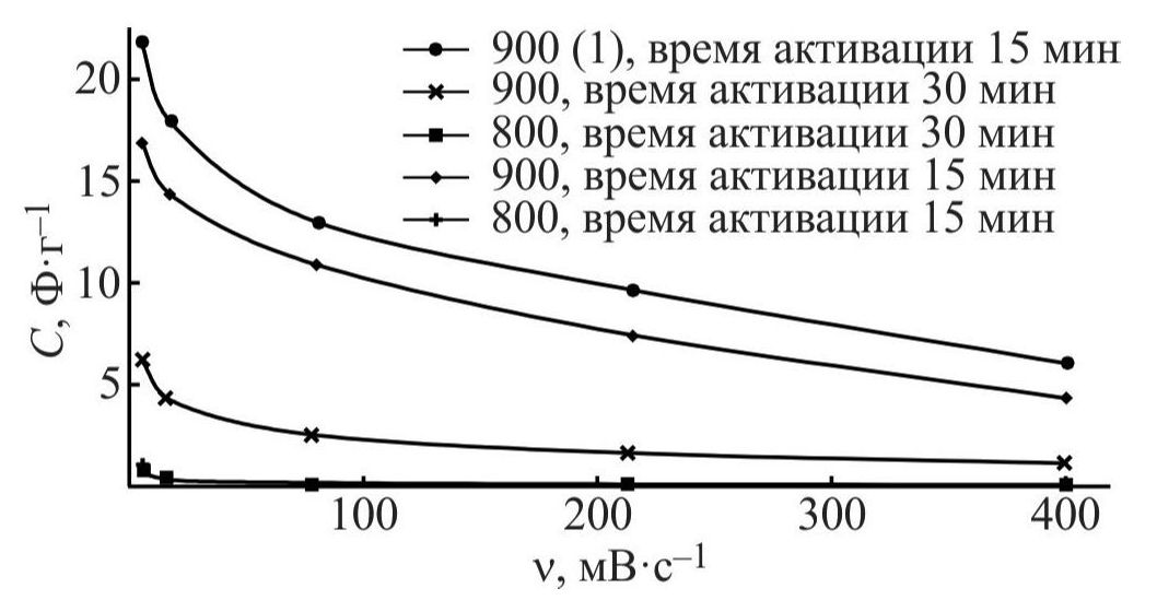 При карбонизации электродов при температуре 800°С емкость СК заметно снижается (рис. 4). С увеличением скорости развертки и времени парогазовой активации результирующая емкость резко падает. Исходя из полученных результатов, можно отметить, что температура карбонизации электродов и время газопаровой активации значительно влияют на электрохимические характеристики СК. Также опытным путем установлено, что увеличение времени активации приводит к ухудшению электрохимических свойств СК — с увеличением времени активации значительно возрастает сопротивление материала, в связи с этим резко снижается значение результирующей емкости. Удельное сопротивление электродов СК составило 350 Ом∙м.