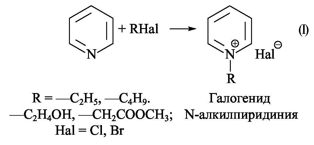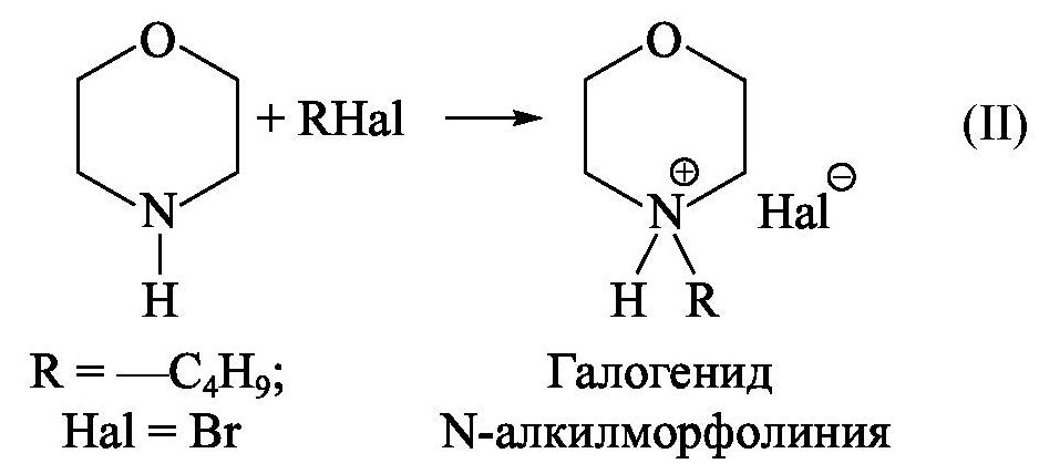 Синтез четвертичных солей пиридина (бромида N-этилпиридиния, бромида N-бутилпиридиния, хлорида N-этанолпиридиния, бромида метилового эфира N-пиридилуксусной кислоты) и третичной соли морфолина (бромида N-бутилморфолиния) проводили в среде растворителя — диметилформамида (х.ч., АО «ЭКОС-1») по стандартной методике кватернизации пиридина (I) (ч., АО «ЭКОС-1») [4] или морфолина (II) (ч., АО «ЭКОС-1») соответствующим галогеналкилом — бромэтаном (х.ч., ООО «АО Реахим»), 1-бромбутаном (ч., ЗАО «Вектон»), метилбромацетатом (ч., ЗАО «Вектон») и 2-хлорэтанолом (х.ч., АО «ЭКОС-1»). Температуру реакции устанавливали в пределах от 30 до 115°С в зависимости от температуры кипения используемого галогеналкила. В некоторых случаях, например, в реакции кватернизации пиридина метиловым эфиром бромуксусной кислоты (ч., ЗАО «Вектон») постоянный нагрев не требовался, так как реакция имела экзотермический характер. Об окончании реакции судили по прекращению тепловыделения в реакционной колбе. Продукты реакции представляли собой кристаллические соли и отделялись от маточного раствора кристаллизацией: вымораживанием при температуре –30°C с последующей фильтрацией. Полученные соли пиридина имели следующие температуры плавления: бромид N-этилпиридиния — Тпл = 120°С, бромид N-бутилпиридиния — Тпл = 104°С, хлорид N-этанолпиридиния — Тпл = 128–130°С.