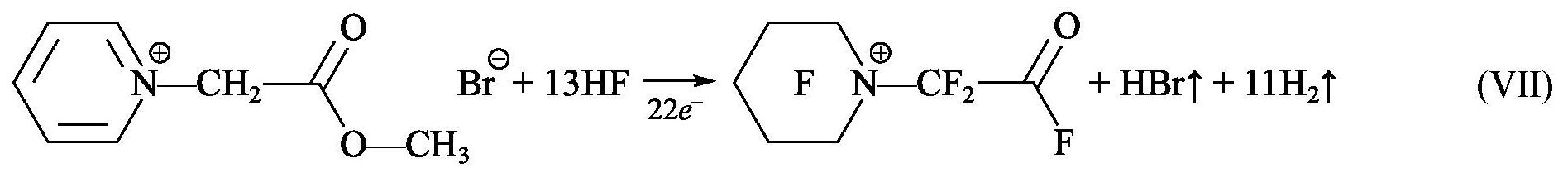 Электрохимическое фторирование хлорида N-этанолпиридиния (VI) и бромида метилового эфира N-пиридинуксусной кислоты позволяет получить фторангидрид перфтор-N-пиперидинуксусной кислоты (VII) — прозрачную жидкость с резким запахом, которая легко гидролизуется на воздухе до перфтор-N-пиперидинуксусной кислоты. Для удобства хранения и идентификации методом ЯМР 19F данный фторангидрид был переведен в метиловый эфир перфтор-N-пиперидинуксусной кислоты посредством метанолиза. Часть сырца была переведена в перфтор-N-пиперидинуксусную кислоту посредством гидролиза (VIII).