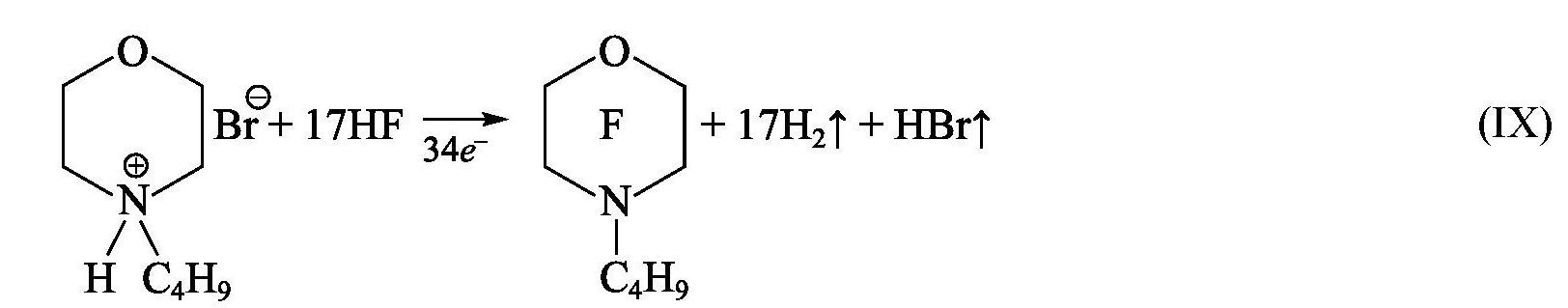 Результатом электрохимического фторирования бромида N-бутилморфолиния является перфтор-N-бутилморфолин (IX). Выход по току для данного электросинтеза составил 29%, продолжительность синтеза — 94.5 ч, удельный расход электричества — 1813 А·ч·л–1. Перфтор-N-бутилморфолин представляет собой прозрачную жидкость с плотностью 1.77 г·см–3 с интервалом температур кипения 117–119°C.