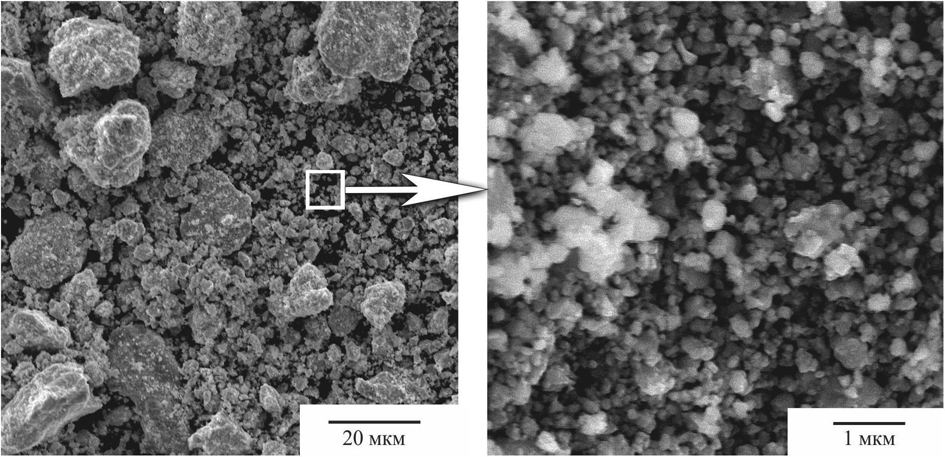 Механохимическое взаимодействие C и Hf при длительности механической обработки 2 мин приводит к образованию композита Hf/C. Механохимическая реакция образования HfC завершается к 8 мин механической активации. В интервале 8‒12 мин реализуются процессы вторичного структурообразования с измельчением образовавшегося карбида. Параметр решетки механосинтезированного HfС после 12 мин механической активации составляет a = 4.6269 Å, что соответствует нестехиометрическому составу HfС0.71 [2]. Формируется наноструктурный карбид с размером частиц 80‒150 нм и размером кристаллитов 9 ± 1 нм. Профиль рентгеновских дифракционных отражений HfC значительно уширен, что может быть связано не только с малым размером кристаллитов, но и с высокой дефектностью зернограничных областей. Высокодисперсные частицы карбида агломерируют до размеров 1–20 мкм (рис. 1).