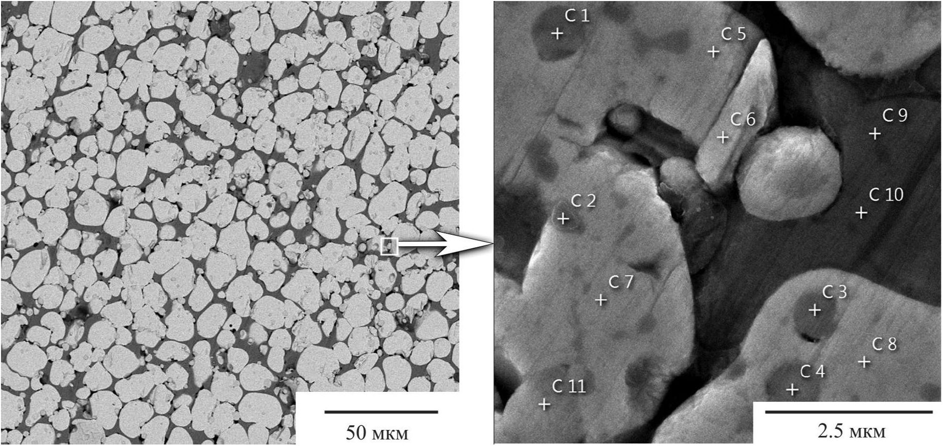 Формируемые зерна карбида имеют округлую форму размером 3‒19 мкм, в них присутствуют сферические включения HfO2 (~3%) размером 0.7‒1.9 мкм. Пористость достигает 6% и образована по типу несплошностей, обусловленных недостаточной смачиваемостью HfC расплавом Fe при спекании. Плотность композита может быть повышена спеканием при более высокой температуре. Микротвердость композитов варьируется в диапазоне значений HV0.2 1241‒1465.