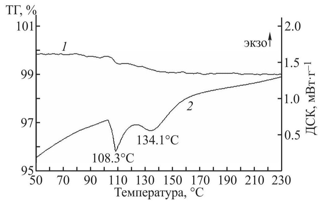 Рис. 1. Результаты термического анализа продуктов гидрирования смеси состава 70 мас% TiFe:30 мас% CeCo3 при 100°C: кривые термогравиметрии (1) и дифференциальной сканирующей калориметрии (2).
