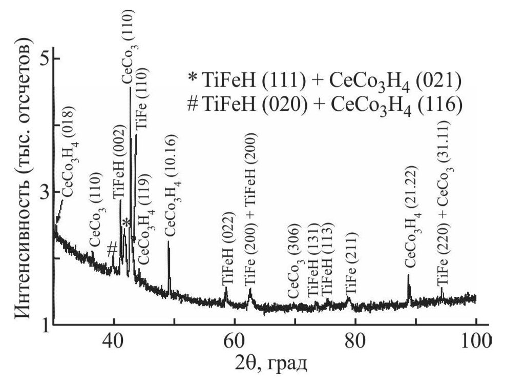 Результат гидрирования подтверждается данными ренгенофазового анализа. В качестве типичного примера на рис. 2 приведена дифрактограмма продуктов гидрирования смеси 90 мас% TiFe + 10 мас% CeCo3. На ней присутствуют рефлексы, отвечающие четырем фазам.