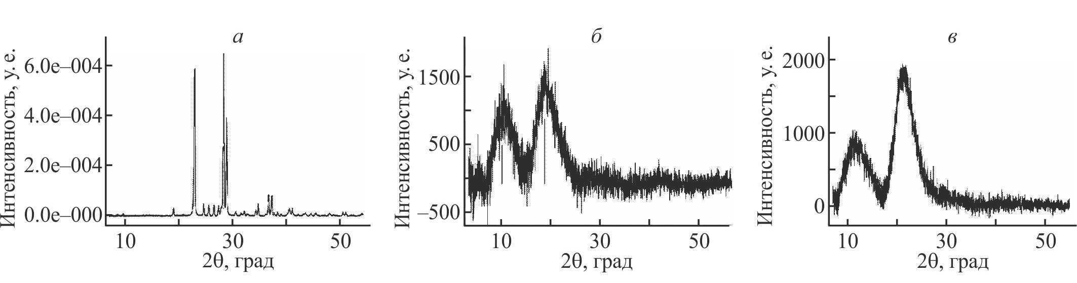Рис. 1. Порошковые рентгеновские дифрактограммы фумаровой кислоты (а), поливинилпирролидона К-12 (б), твердой дисперсии фумаровой кислоты с ПВП К-12 (в)