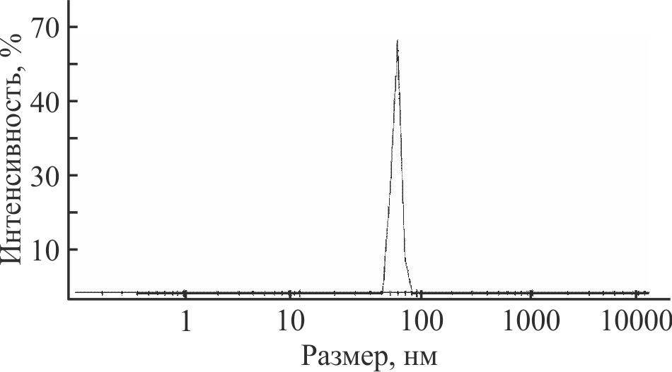В пользу высказанного предположения свидетельствуют данные анализа размеров частиц, которые подтверждают, что в растворе твердой дисперсии фумаровой кислоты с поливинилпирролидоном К-12 образуются агрегаты с узким распределением частиц по размерам (рис. 3). Средний диаметр составляет 67 нм, что указывает на образование коллоидной системы при растворении [15].