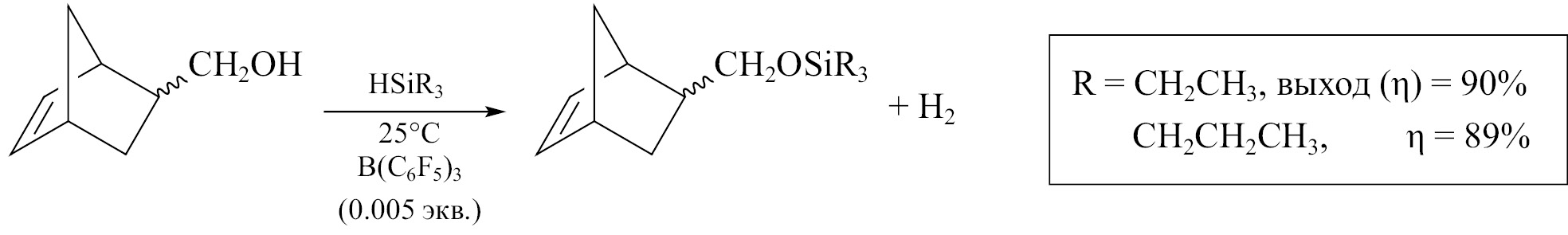 Самым широко используемым методом синтеза производных норборненов является реакция Дильса–Альдера [3]. В ходе реакции происходит сочетание диена (циклопентадиена) с соответствующим диенофильным фрагментом (I). Альтернативным подходом к синтезу замещенных норборненов является модификация норборненов, содержащих подходящую для этого функциональную группу. В литературе представлен способ синтеза производных норборнена, имеющих Si—O—C-фрагменты в боковых заместителях [12]. Данный метод основан на реакции Пирса–Рубинштейна — взаимодействии силанов и спиртов, катализируемом кислотой Льюиса [B(C6F5)3] (II) [13].
