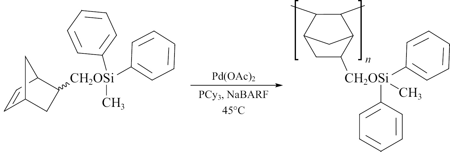 Аддитивная полимеризация (5-норборнен-2-метилокси)метилдифенилсилана (AP-NBCH2OSiPh2Me). Пример приведен для полимеризации при молярном соотношении мономер/Pd, равном 3000/1, и концентрации мономера, равной 0.5 M. Эксперименты при других условиях выполняли аналогично. Полимеризацию проводили в главбоксе, в атмосфере аргона. Раствор каталитической системы готовили в виале непосредственно перед полимеризацией. Для этого растворы Pd(OAc)2 (1.6 · 10–1 мл, 2.3 · 10–3 ммоль, 2.00 · 10–2 М), NaBArF (8.1 · 10–1 мл, 1.2 · 10–2 ммоль, 2.0 · 10–2 М) и PCy3 (3.3 · 10–1 мл, 4.7 · 10–3 ммоль, 2.0 · 10–2 М) в абсолютном хлороформе смешивали в виале и перемешивали в течение 5 мин. Мономер (NBCH2OSiPh2Me, 1.50 г, 4.70 ммоль) и абсолютный хлороформ (0.69 мл) добавляли в виалу. Полимеризацию инициировали путем добавления 0.94 мл раствора каталитической системы в виалу с мономером и последующего перемешивания в течение 5 мин. Реакционную смесь нагревали до 45°С. Нагрев продолжали до прекращения изменения вязкости (в течение 72 ч). Затем реакционную смесь разбавляли абсолютным толуолом (2 мл) и осаждали полимер добавлением смеси к абсолютному метанолу. Образовавшийся полимер промывали несколькими порциями абсолютного метанола и высушивали в вакууме. Затем полимер дважды переосаждали из абсолютного толуола в абсолютный метанол по описанной выше методике и высушивали в вакууме при 80°С до постоянной массы. Выход полимера (AP-NBCH2OSiPh2Me): 1.13г (75%). Mw = 6.8 · 105, Mw /Mn = 3.1, Tс = 283°C.