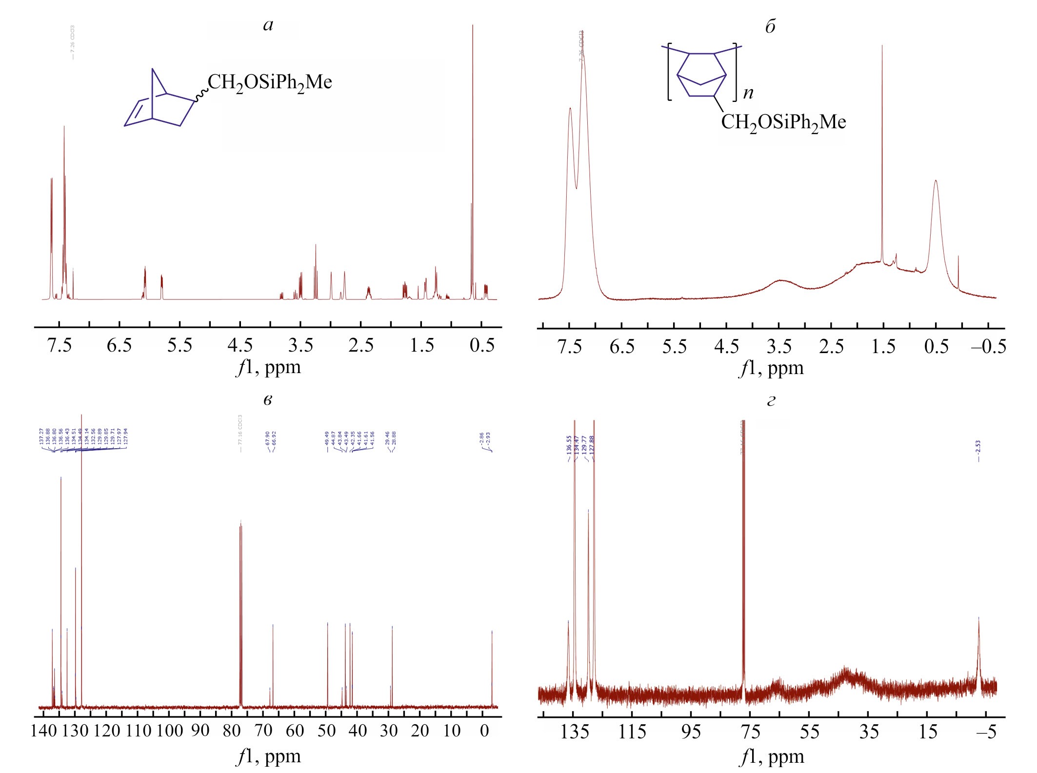 В аддитивной полимеризации фенилсодержащий мономер (NBCH2OSiPh2Me) проявляет меньшую активность по сравнению с триметилсилильным аналогом (NBCH2OSiMe3) (табл. 1). Структура синтезированного полинорборнена была подтверждена методом спектроскопии ядерно-магнитного резонанса (ЯМР) на ядрах 1H и 13C (рис. 1). В спектрах аддитивного полимера отсутствуют сигналы протонов двойной связи (6.5–5.5 м. д. в спектре 1H ЯМР мономера) и присутствуют сигналы ароматических водородов (7.5–6.5 м. д. в спектрах 1H ЯМР мономера и полимера и 140–125 м. д. для спектров 13C ЯМР).