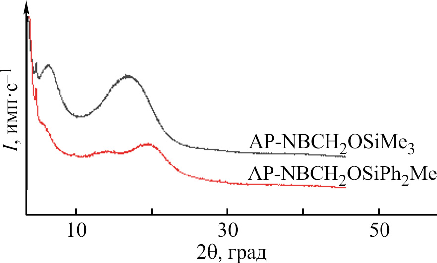 Рис. 3. Дифрактограммы аддитивного поли((5-норборнен-2-метилокси)триметилсилана) (AP-NBCH2OSiMe3) [12] и аддитивного поли((5-норборнен-2-метилокси)-метилдифенилсилана) (AP-NBCH2OSiPh2Me)