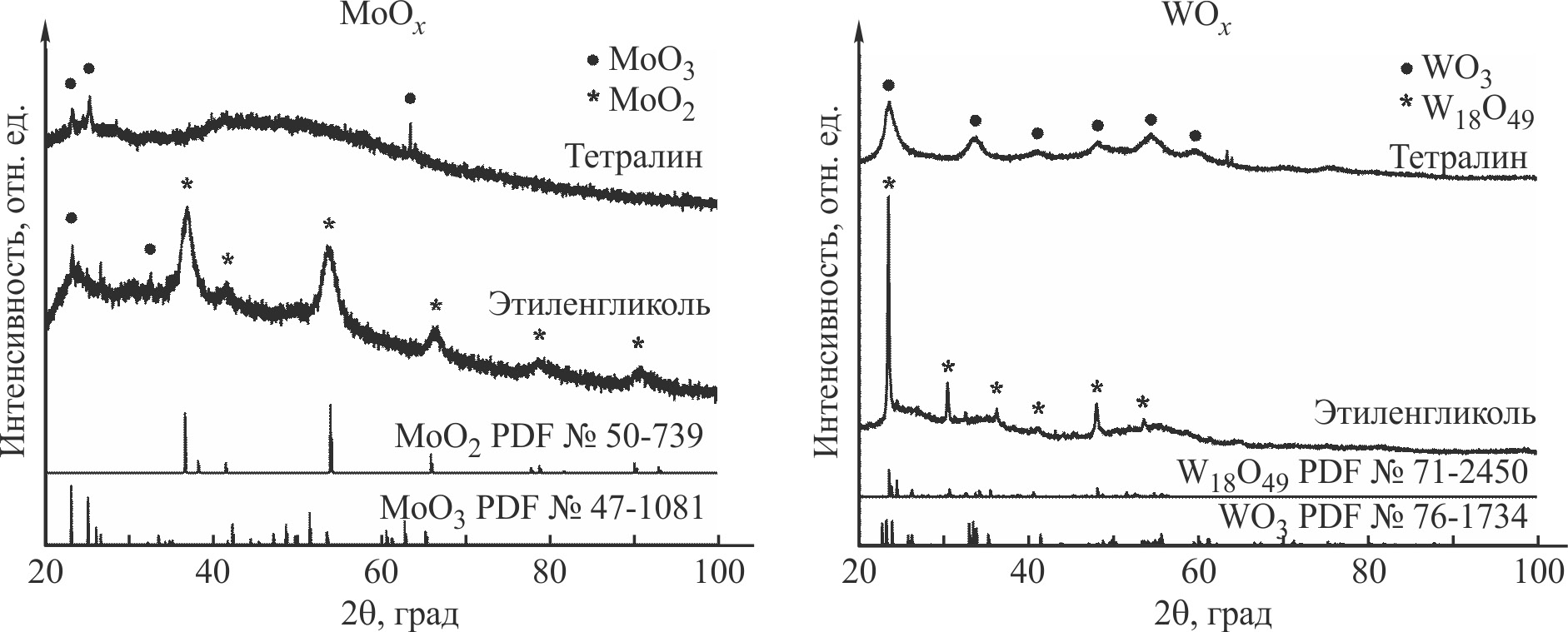 Оксидные катализаторы, полученные в неполярном и полярном растворителях (тетралине и этиленгликоле), были исследованы физико-химическими методами анализа. Методом рентгенофазового анализа (рис. 1) в MoOx катализаторе, сформированном в этиленгликоле, установлено наличие как MoO2 (PDF № 50-739), так и MoO3 (PDF № 47-1081) кристаллических фаз, в то время как в тетралине подтверждено образование только кристаллической фазы MoO3. В обоих катализаторах выявлено наличие аморфной составляющей. В катализаторе WOx, полученном в этиленгликоле, установлено образование кристаллической фазы W18O49 (PDF № 71-2450). В катализаторе, полученном в тетралине, подтверждено образование фазы WO3 (PDF № 76-1734). Аморфная составляющая также присутствует в обоих катализаторах. Образование в этиленгликоле фаз MoO2 и W18O49 со степенями окисления металла +4 и +5 соответственно свидетельствует о том, что восстановление катализатора происходит в большей степени в этиленгликоле, чем в тетралине.