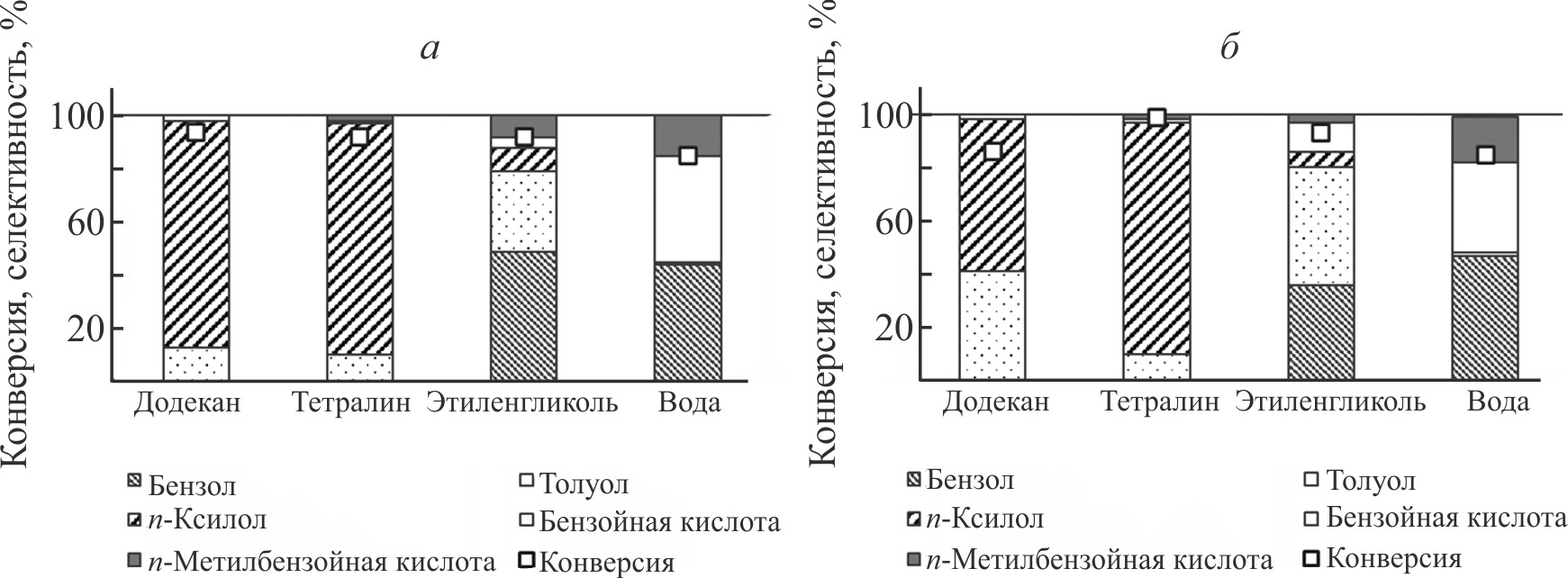 Рис. 2. Конверсия терефталевой кислоты и селективность по продуктам реакции в различных растворителях в присутствии: а — MoOx, б — WOx