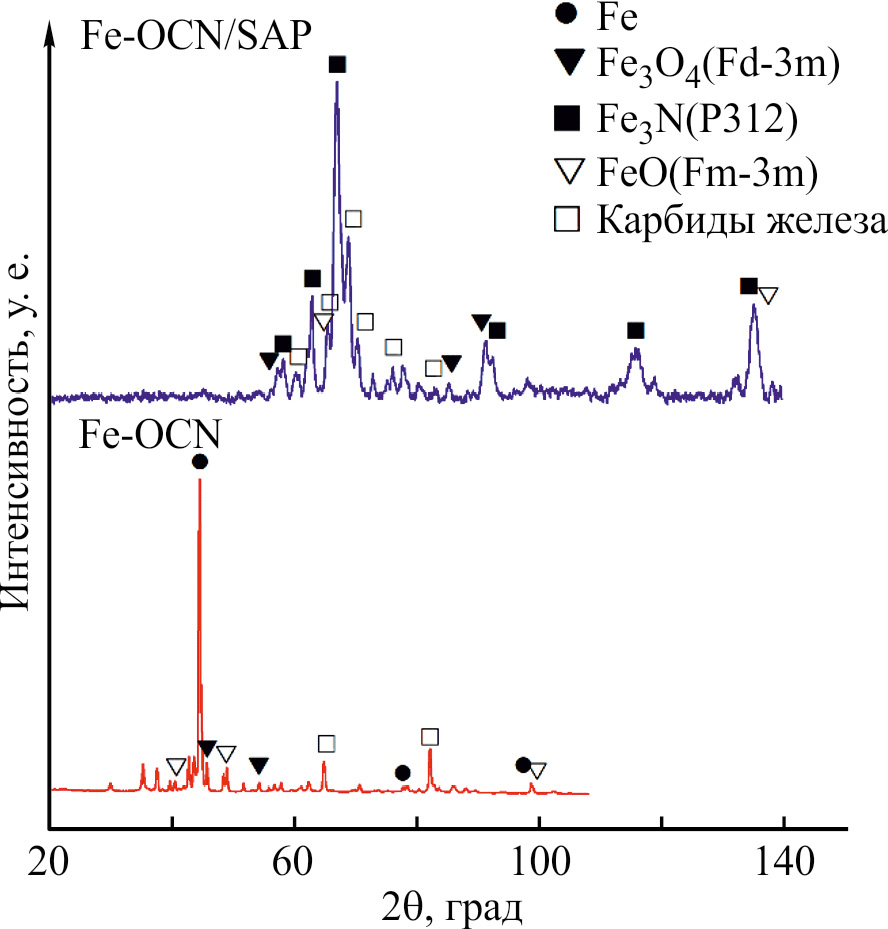 На дифрактограмме катализатора Fe–OCN присутствуют рефлексы, соответствующие фазам Fe, цементита Fe3С и оксидов железа FeO и Fe3O4 (рис. 1). По расчетам, выполненным методом Ритвельда, определен количественный состав железосодержащих фаз катализатора Fe–OCN: 41.8% Fe, 32.2% Fe3С, 6.9% Fe3O4 и 19.0% FeO. В составе Fe–OCN/SAP присутствуют фазы метастабильного нитрида Fe3N, оксидов Fe3O4 и FeO, χ-карбида Fe5C2, ε-карбида Fe2C и цементита Fe3C. Ввиду существенной погрешности из-за большего количества пересекающихся рефлексов, относящихся к фазам карбидов железа и характеризующихся схожими структурными параметрами, количественный фазовый расчет для Fe–OCN/SAP не представлен. Одной из особенностей фазообразования, протекающего в таких условиях синтеза, является наличие не окисленного в процессе синтеза углерода, который во время изотермической выдержки участвует в процессах восстановления и частичной карбидизации железа. В результате процесса образуются Fe5C2 и Fe2C, являющиеся активными фазами в реакции гидрирования CO2 в длинноцепочечные олефины [4, 5].