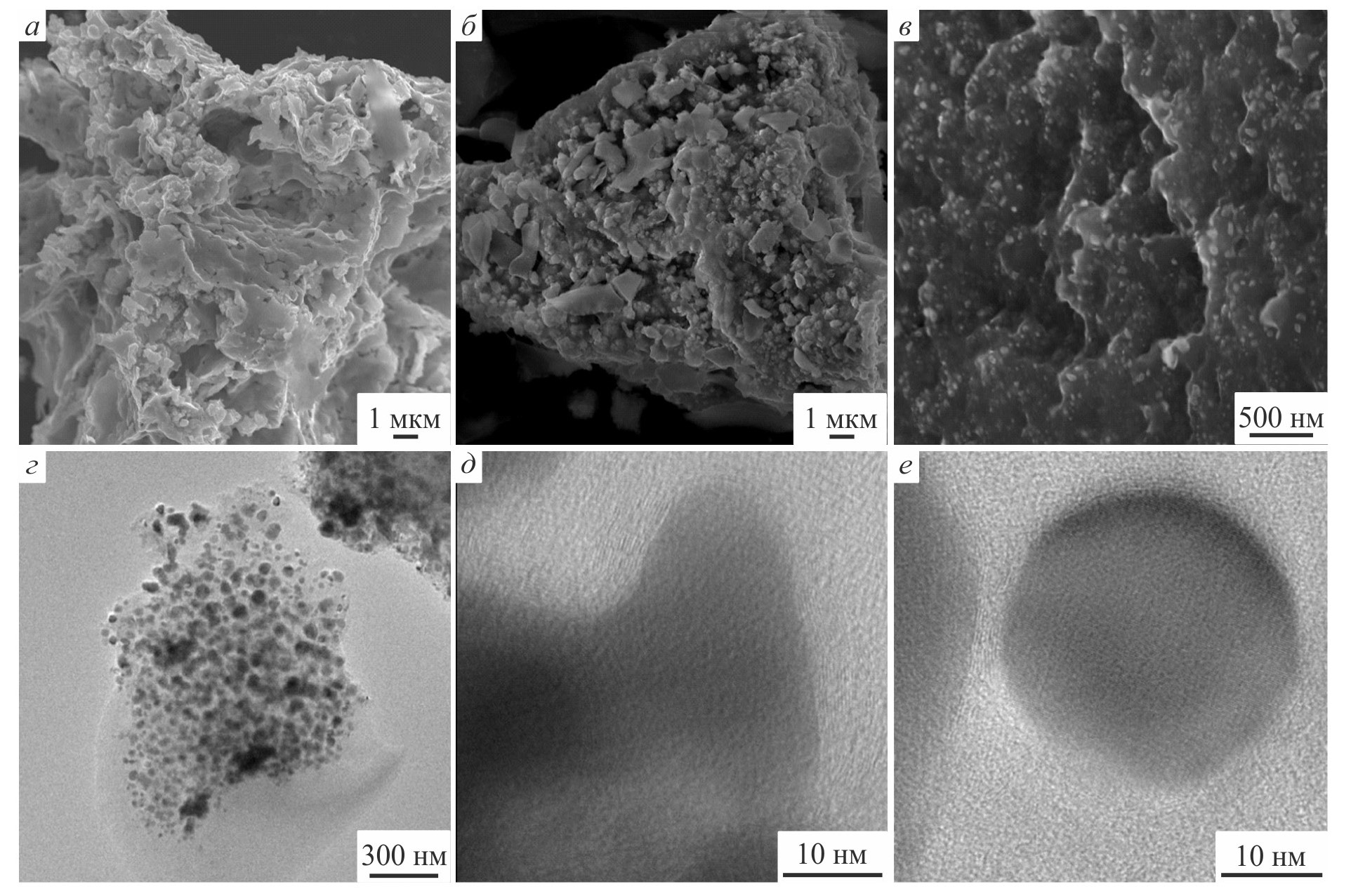 Рис. 2. Изображения катализаторов, полученные методами: сканирующей электронной микроскопии Fe–OCN (а), Fe–OCN/SAP (б, в); просвечивающей электронной микроскопии Fe–OCN/SAP (г–е); SAP — сополимер акрилата натрия и акриламида