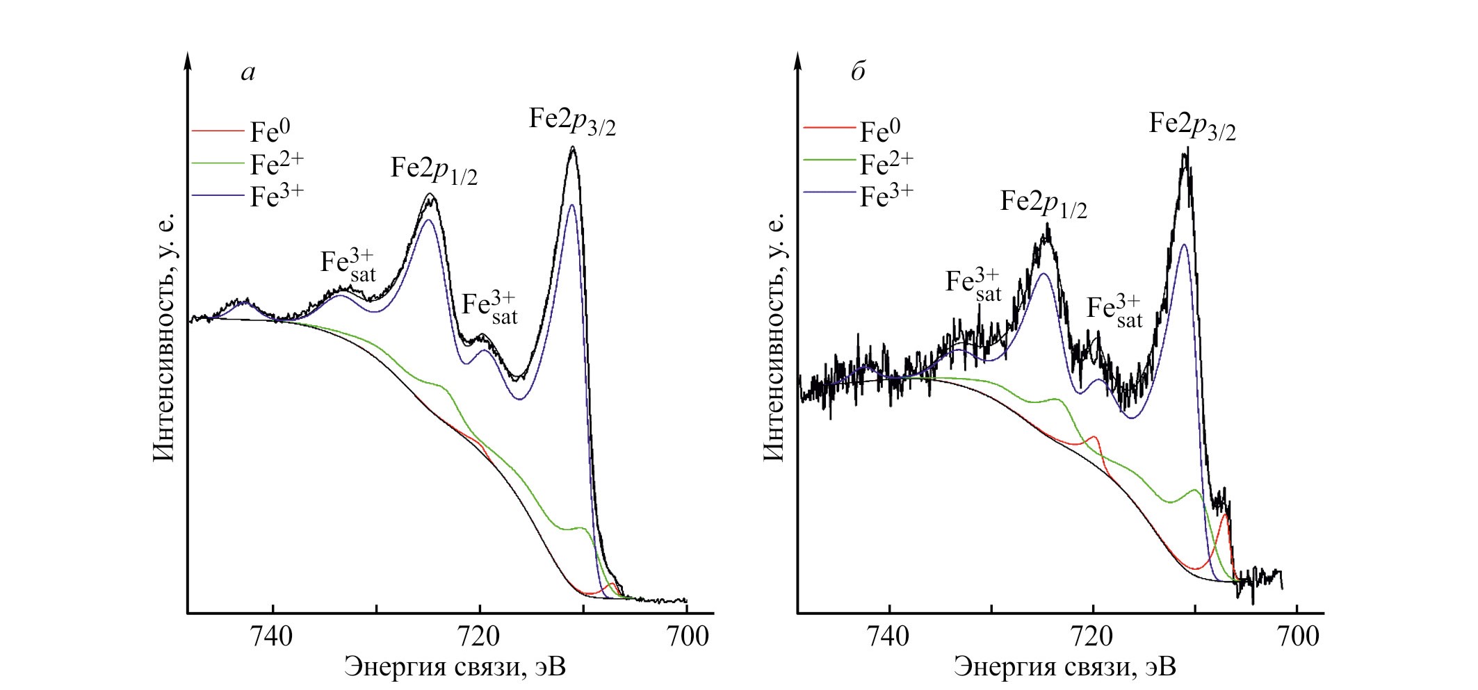 Рис. 3. Спектры Fe2p-электронов катализаторов: а — Fe–OCN, б — Fe–OCN/SAP; SAP — сополимер акрилата натрия и акриламида