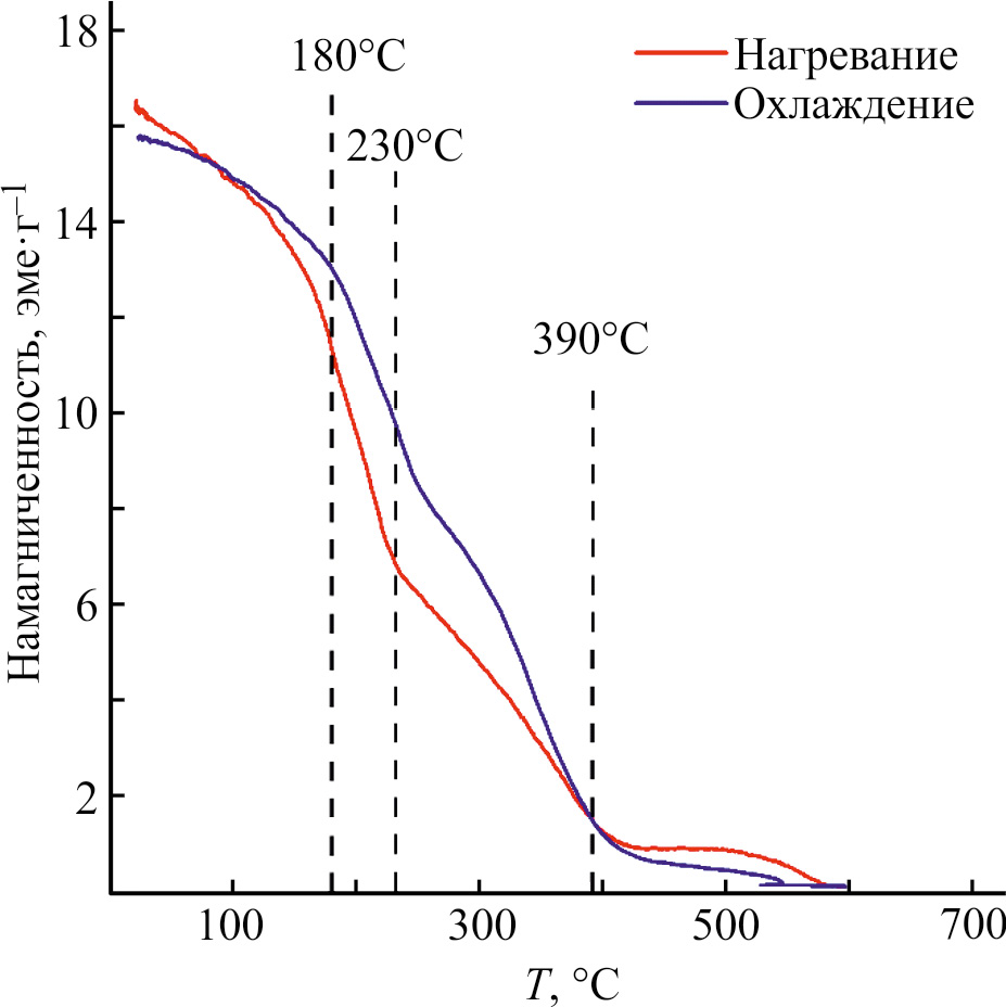 Перегибы кривой зависимости намагниченности от температуры наблюдаются при температурах 180, 230 и 390°С в процессе нагревания (рис. 4). Температуры 230 и 380°С соответствуют температурам Кюри карбидов железа (210°С для цементита Fe3C, 250°С для χ-карбида Fe5C2 и 380°С для ε-карбида Fe2C). При этом перегиб, соответствующий температуре Кюри Fe3N при 300°С, отсутствует или незаметен на фоне других изменений в многокомпонентной системе. Перегиб при 180°С на кривой зависимости намагниченности при нагревании и охлаждении не может быть объяснен разложением или восстановлением Fe3N, так как намагниченность, во-первых, увеличилась бы в некотором температурном диапазоне, пока происходит процесс разложения или восстановления Fe3N, а, во-вторых, этот перегиб бы не фиксировали в процессе охлаждения. Остаточная намагниченность обусловлена присутствием Feили Fe3O4 в образце Fe–OCN/SAP.
