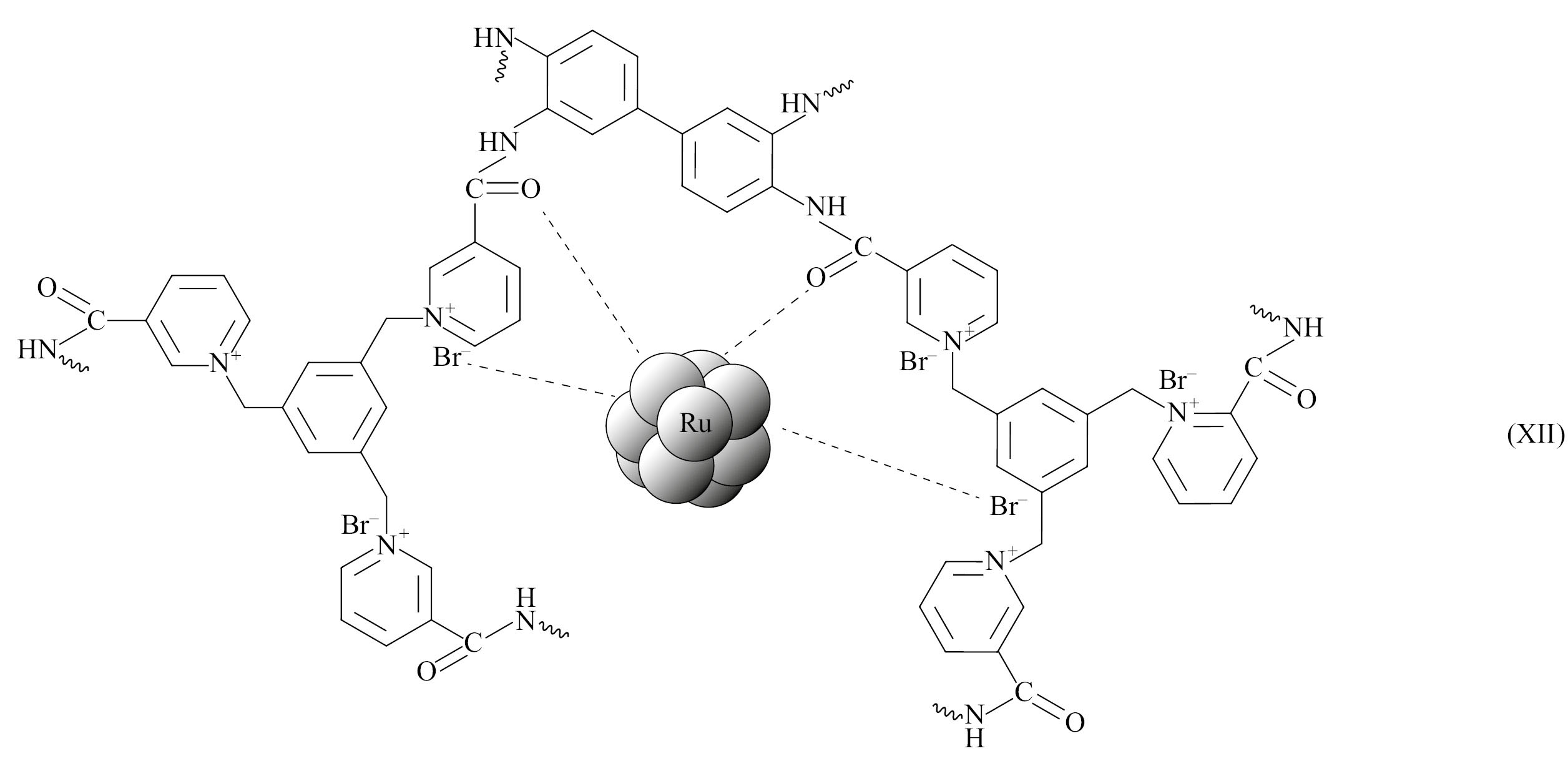 Гиперразветвленные полимеры по своей структуре похожи на дендримеры и являются их альтернативой в связи с менее трудоемкой процедурой их синтеза. В исследовании [75] разработаны нанокомпозиты (X) на основе сверхразветвленного пиридилфениленового полимера (III), служащие мультилигандной стабилизирующей матрицей для наночастиц Ru.