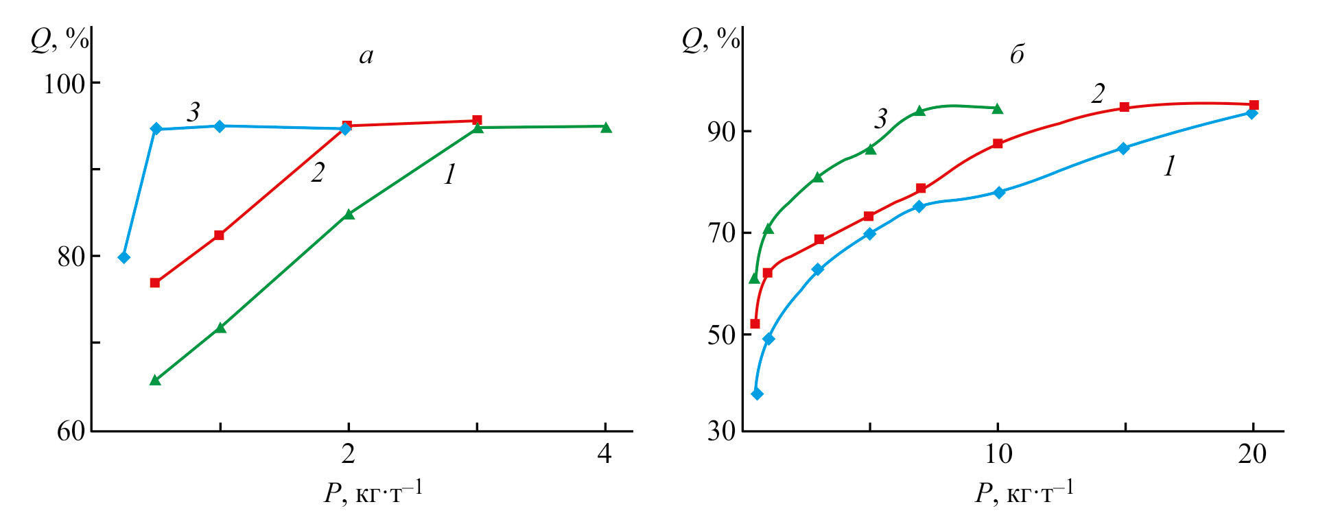 Зависимость доли выделенного полимера Q (мас%) от расхода комбинированного коагулянта хлорид натрия–бензилтриметиламмоний хлорид (Р, кг·т–1 каучука) при температуре коагуляции 1–2 (а) и 60°С (б).