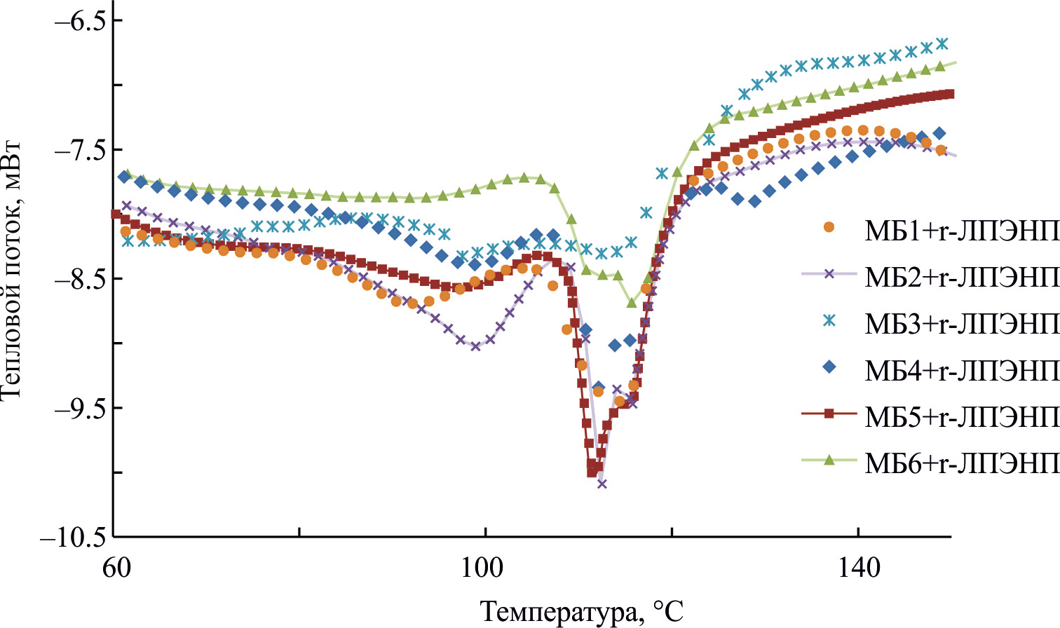 Сравнительный анализ кривых теплового потока модельных смесей показал, что процесс нагревания описывается двумя эндотермическими эффектами в температурных интервалах 90–110 (далее — низкотемпературный интервал) и 110–120°С (далее — высокотемпературный интервал), что свидетельствует о присутствии как минимум двух типов кристаллитов r-ЛПЭНП в смесях, которые можно охарактеризовать, например, как кристаллиты с менее и более плотными упаковками или построенные из низко- и высокомолекулярных фрагментов соответственно. Выявлены также следующие закономерности: