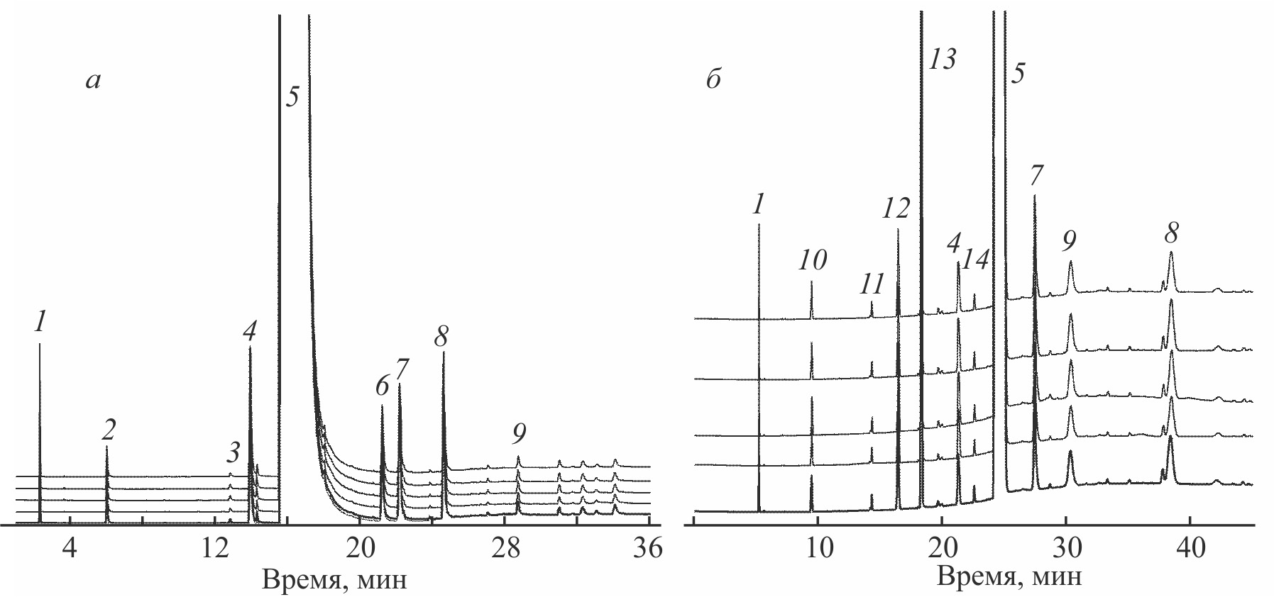 Рис. 2. Пять последовательных хроматограмм R-114В2, полученных в одинаковых условиях с использованием колонок GS-GasPro (а) и ПТМСП032 (б).