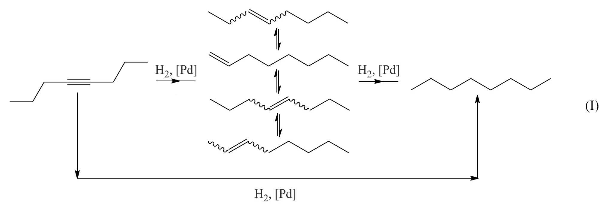 При гидрировании алкинов возможно образование смеси изомерных алкенов и соответствующих алканов (I).