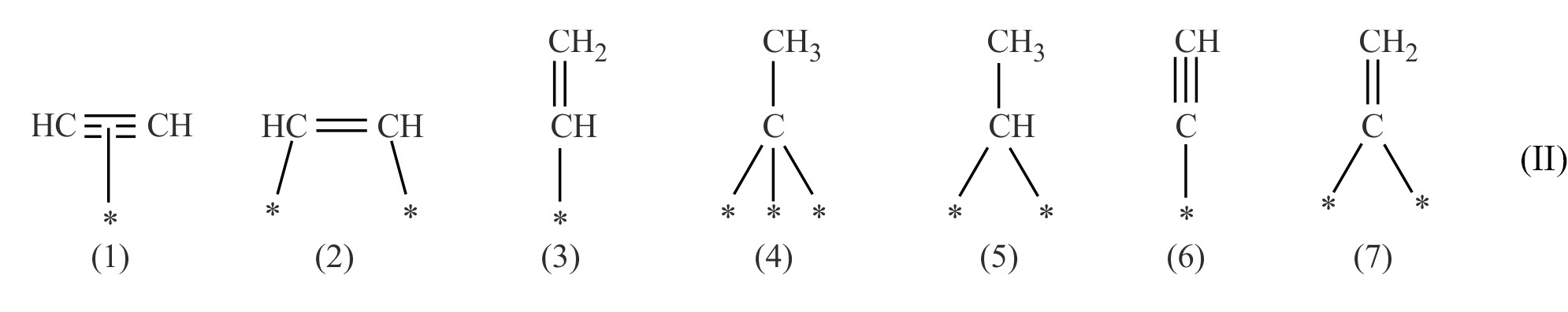 π-Адсорбированный ацетилен (1) переходит в ассоциативно адсорбированный плосколежащий ди-σ-связанный фрагмент (2), а затем в винил (3), являющийся предшественником этилена. Также возможно формирование трех- и двукратно связанных поверхностных интермедиатов, например этилидина (4) и этилидена (5), которые впоследствии гидрируются до этана. Диссоциативно адсорбированный ацетилен (6) и винилиден (7) участвуют в образовании олигомеров и бензола. Следует отметить, что наличие заместителей при тройной связи существенно влияет на способность замещенных соединений ацетиленовой группы адсорбироваться на поверхности: прежде всего невозможным становится образование некоторых промежуточных состояний (например, алкилидинов и алкилиденов в случае дизамещенных алкинов), а также возможно ослабление взаимодействия алкина с поверхностью из-за стерических ограничений. В случае гидрирования замещенных алкинов важную роль также играет изомеризация C=C-связи, которая происходит путем миграции водорода внутри молекулы субстрата через образование π-аллильных промежуточных комплексов.