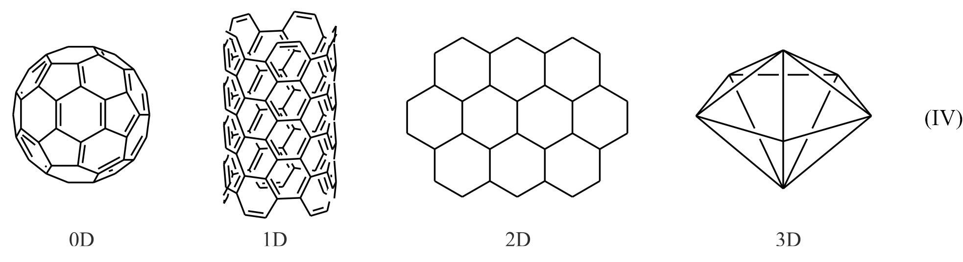 Углеродные материалы рассматриваются как перспективные носители для наночастиц палладия благодаря ряду отличительных свойств: химической инертности и высокой стабильности, высоким значениям удельной площади поверхности, развитой пористости, высокой тепло- и электропроводности [83]. Они также характеризуются низкой стоимостью производства. Углеродные материалы могут быть представлены в различных аллотропных модификациях (алмаз, графен, фуллерены, активированный уголь, углеродные нанотрубки и волокна), разнообразных формах (от порошков до волокон), а также во всех пространственных размерностях (от нульмерных фуллеренов и одномерных нанотрубок до двумерного графена и трехмерного алмаза) (IV). Их синтез может быть осуществлен различными методами, причем некоторые методики масштабированы до уровня производств, что способствует промышленному использованию углеродных материалов, в том числе в качестве носителей для катализаторов [84].