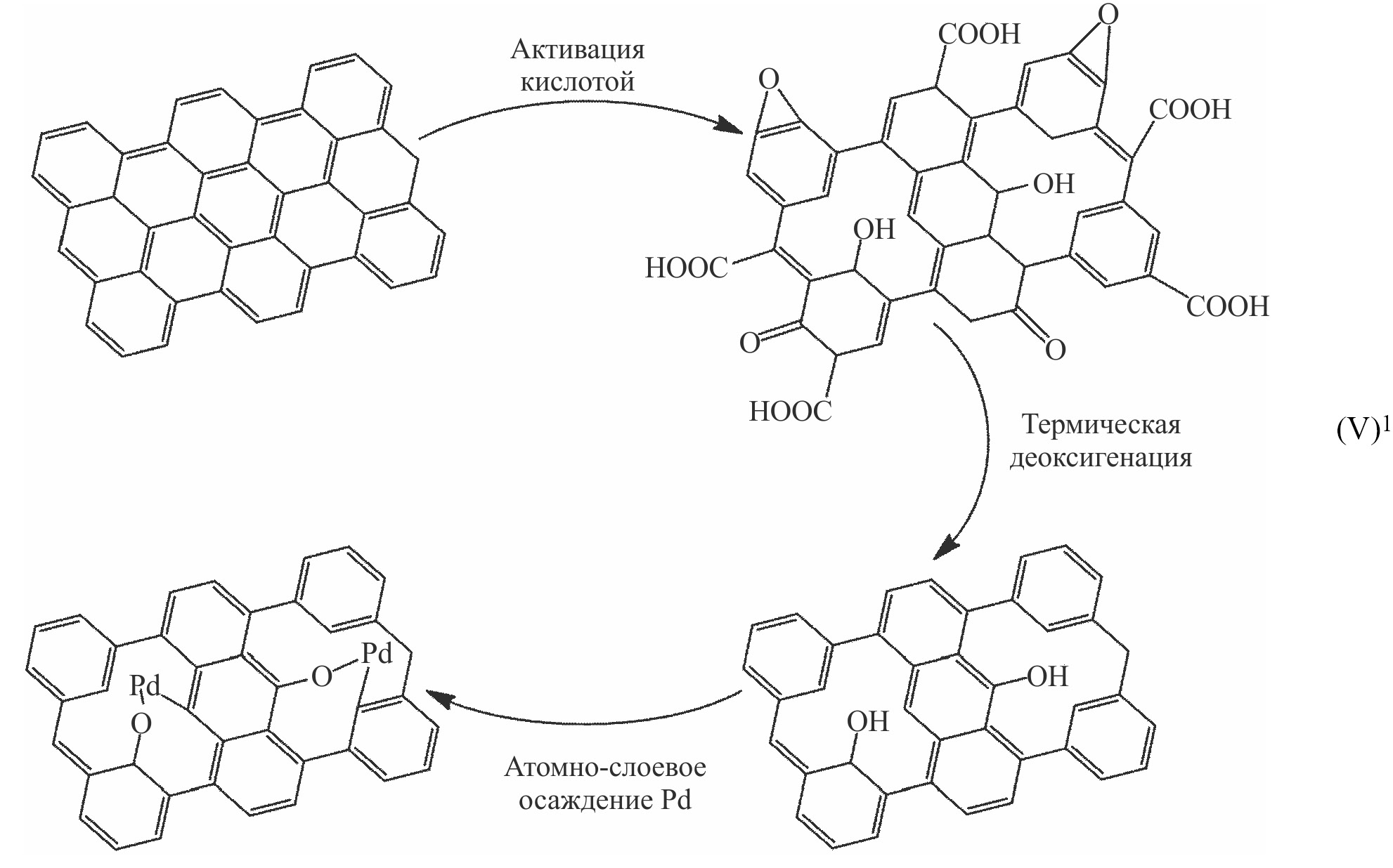 Контроль содержания и природы полученных на поверхности углеродных материалов в результате активации кислородсодержащих функциональных групп может осуществляться путем термической деоксигенации в инертной атмосфере. Так, в работах [97, 98] было показано, что при 1050°С уже спустя 2 мин на поверхности графенового слоя остается преимущественно фенольный кислород. На основе полученного материала методом атомно-слоевого осаждения был синтезирован катализатор Pd1-O/graphene с моноатомными центрами палладия (V). Содержание металла составило 0.25 мас%; он был равномерно распределен на поверхности носителя в форме изолированных атомов, при этом авторы отмечали наличие незначительного количества кластеров Pd. Pd существовал на поверхности носителя преимущественно в форме Pd(+2) и был координирован с фенольным кислородом и одним атомом углерода графена. Катализатор Pd1-O/graphene был испытан в селективном гидрировании 1,3-бутадиена, где демонстрировал 100%-ную селективность по бутенам вплоть до 95% конверсии субстрата, при этом селективность по бутену-1, целевому продукту гидрирования, сохранялась почти постоянной на уровне 71%. Кроме того, катализатор Pd1-O/graphene демонстрировал устойчивость к дезактивации на протяжении 100 ч реакции.