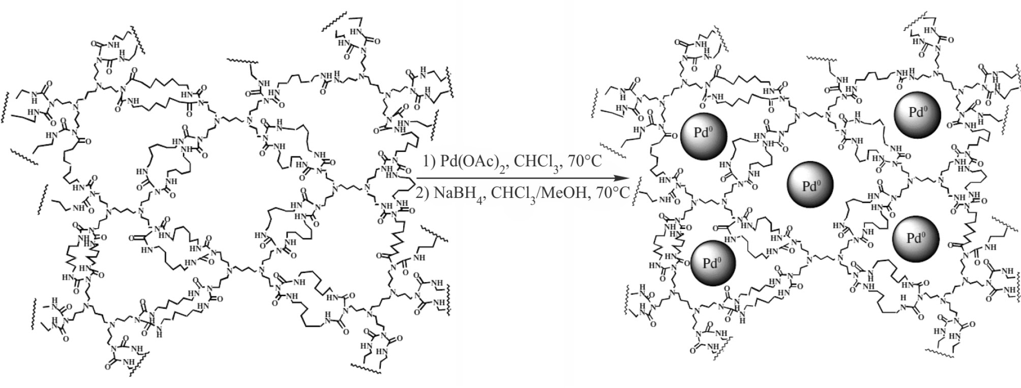 Чтобы избежать ограничений массопереноса субстратов и продуктов, но сохранить обеспечиваемый дендронами контроль морфологии наночастиц и повышенную селективность, макромолекулы и полимеры можно прививать на внешнюю поверхность материалов. Например, в работе [69] синтез модифицированного аминогруппами сферического мезопористого SiO2 осуществляли путем обработки материала (3-аминопропил)-триметоксисиланом. Изготовленный на основе данного материала катализатор 5%Pd/SiO2-C3H6-(30%)NH2 характеризовался более равномерным распределением частиц по размерам по сравнению с коммерческими катализаторами 5%Pd/γ-Al2O3, 5%Pd/SiO2 и 5%Pd/C, средний размер частиц изменялся в ряду 5%Pd/γ-Al2O3 ≈ 5%Pd/C ˃ > 5%Pd/SiO2 ˃ 5%Pd/SiO2-C3H6-(30%)NH2. В случае синтезированного в работе катализатора отмечали повышение активности почти в 2 раза относительно коммерческих образцов, что объясняли сильным электронным взаимодействием аминогрупп и активной фазы (25°С, 1 атм H2, субстрат/Pd = 30 моль/моль). Другим способом закрепления разветвленных аминов на поверхности оксида кремния является использование азиридина [66]. С одной стороны, использование данного реагента позволяет сократить количество стадий в синтезе носителя, с другой — следует отметить высокую канцерогенность данного реагента, затрудняющую его применение.