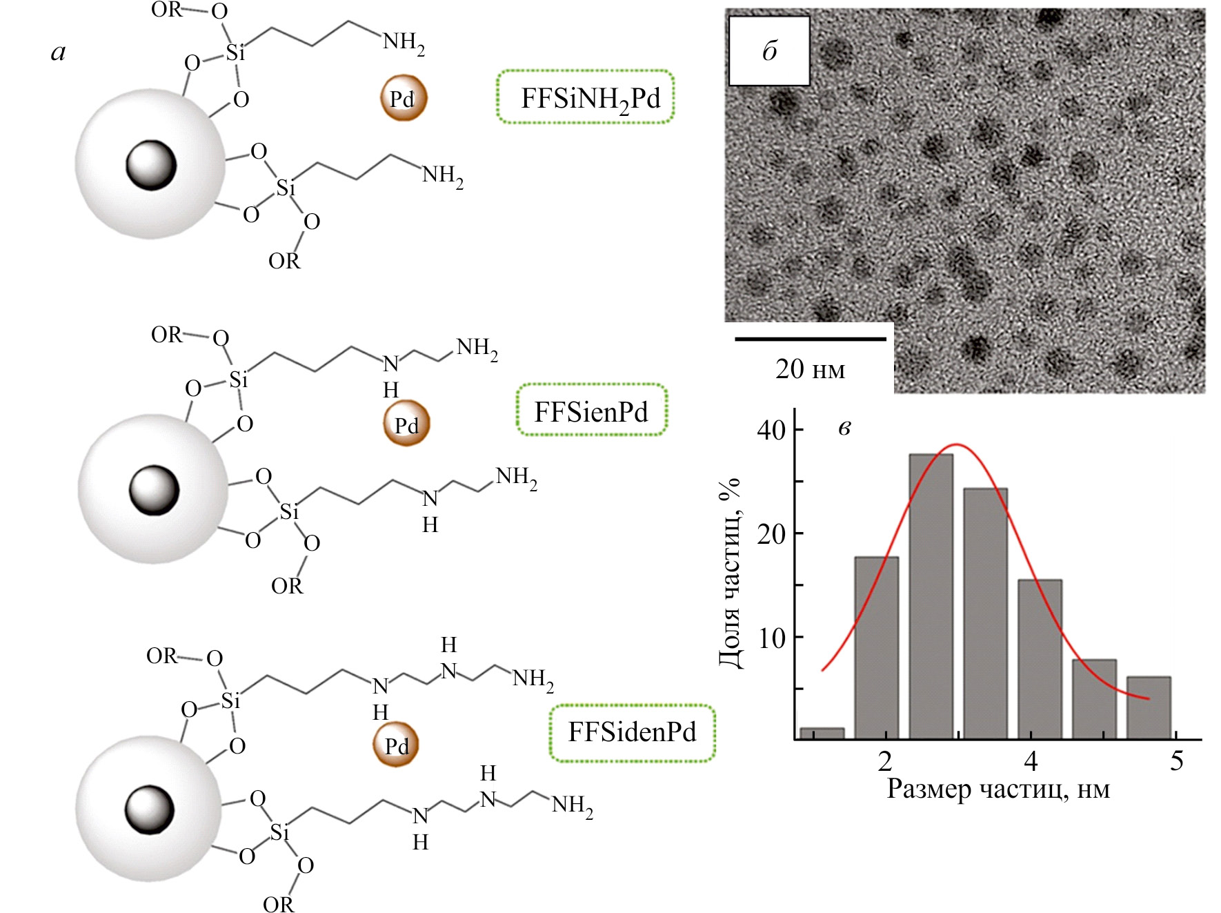 Рис. 2. Схематичное изображение катализаторов FFSiLPd (L = -NH2, -en, -den) (а), микрофотография коллоидного палладия (б), распределение наночастиц палладия по размерам (в) [70].[2]