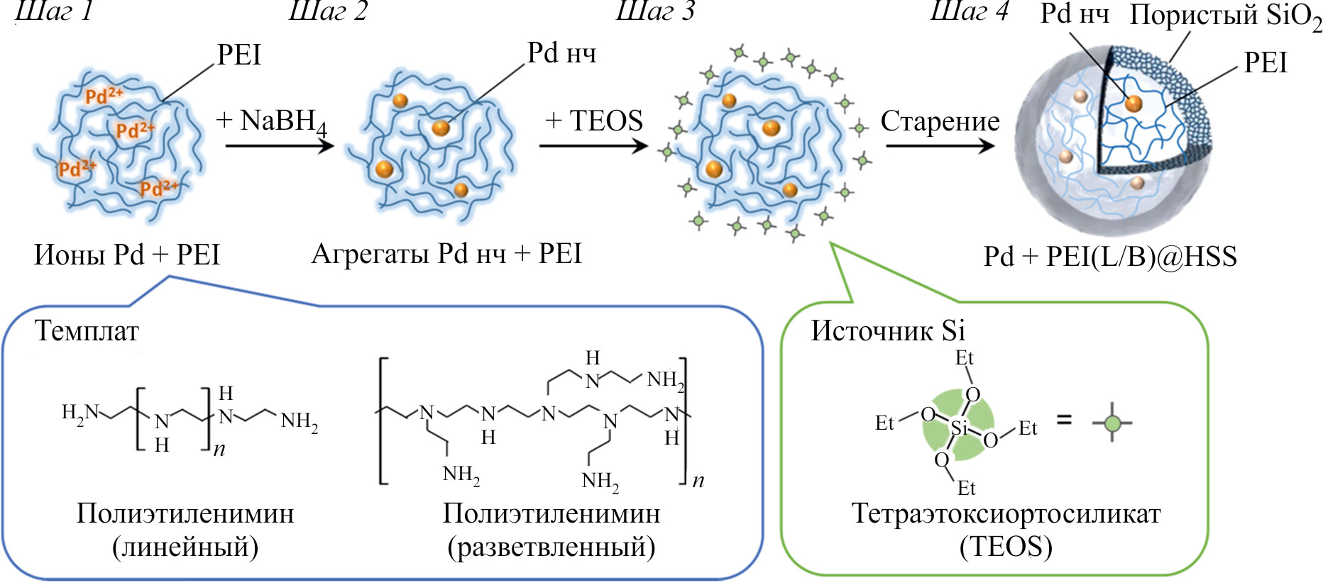 Для исключения диффузионных ограничений при модификации мезоструктурных силикатов полиэтиленимином необходимо подбирать фрагменты полимера определенной массы. Данная проблема была решена в работе [77] путем использования систем типа ядро–оболочка, где в роли «оболочки» выступал мезопористый оксид кремния, а «ядром» являлись наночастицы палладия, координированные линейным или разветвленным полиэтиленимином для Pd + PEI(L)@HSS и Pd + PEI(B)@HSS соответственно. Синтез катализатора проводили последовательно в одной колбе без выделения промежуточных продуктов (рис. 3). Содержание металла в обоих катализаторах было одинаковым (1.1% Pd), в то время как средний размер частиц и толщина силикатной оболочки составляли 9.0 и 49 нм для Pd + PEI(L)@HSS и 6.0 и 36 нм для Pd + PEI(B)@HSS, что связывали с меньшей среднемассовой молекулярной массой полиэтиленимина в случае последнего. Полученные в работе катализаторы были испытаны в селективном гидрировании дифенилацетилена и фенилацетилена (50°С, 1 атм H2, субстрат/Pd = 200 моль/моль). В случае обоих субстратов большей активностью характеризовался Pd + PEI(B)@HSS, что связано с меньшей толщиной силикатной оболочки. Между тем Pd + PEI(L)@HSS отличался большей селективностью в гидрировании фенилацетилена, что связывали с более эффективной координацией наночастиц палладия линейным полиэтиленимином, характеризующимся наличием в структуре почти исключительно вторичных атомов азота и, как следствие, меньшими стерическими затруднениями. Также была доказана возможность повторного использования катализатора Pd + PEI(L)@HSS на протяжении как минимум пяти циклов без потери активности и селективности.