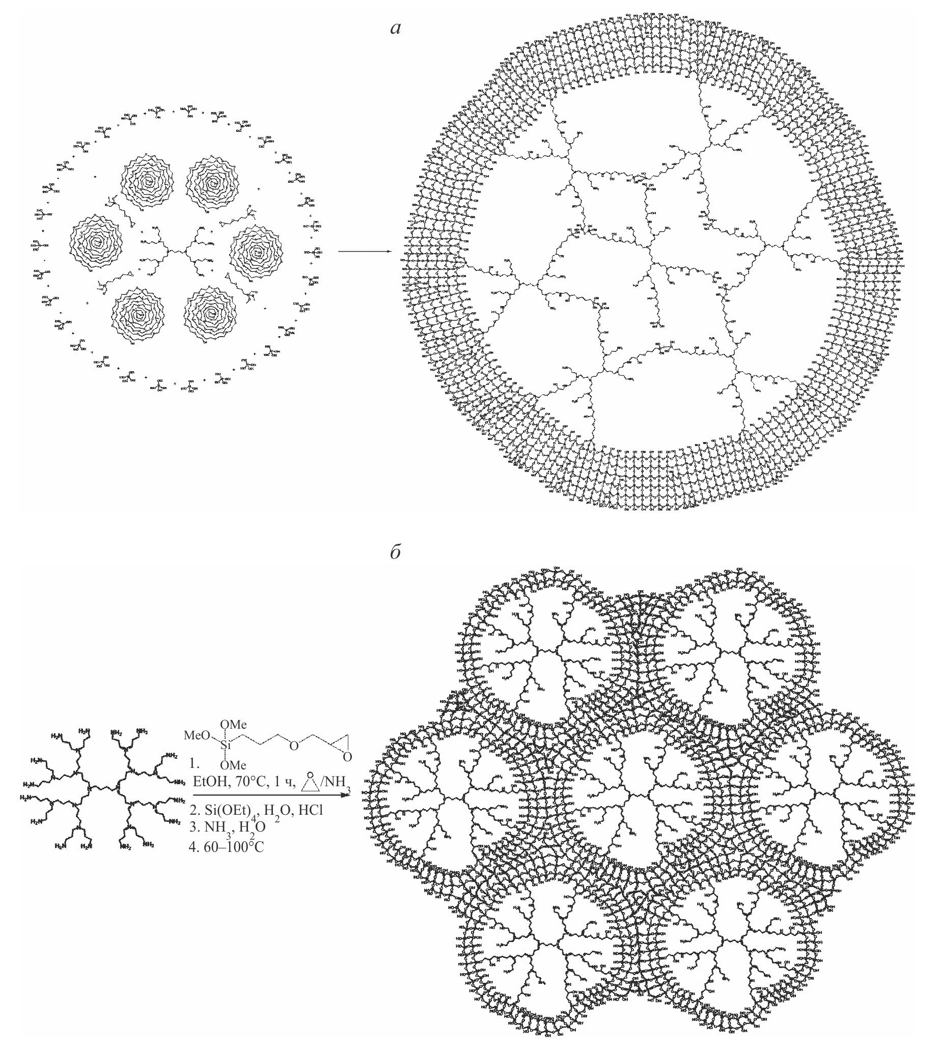 Рис. 4. Схема синтеза дендримерсодержащих гибридных органо-силикатных материалов: G3-dendr-SiO2 (а), G2-dendr-meso-SiO2 (б) [80].5