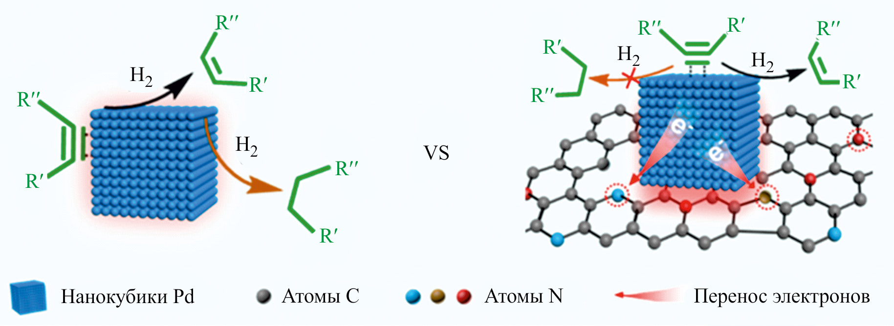Наносферические углеродные материалы могут быть получены в форме не только полых сфер, но также клубков из углеродных нановолокон. Такой подход был реализован в работе [113], где углеродный носитель синтезировали на основе хитозана в системе NaOH/мочевина/вода–изооктан. Полученные углеродные микросферы характеризовались средним размером 47.6 ± 12.6 нм и иерархической структурой мезо-/макропор. В качестве активной фазы выступали синтезированные заранее нанокубики палладия (Pd NCs, средний размер 8.8 нм), нанесение которых проводили путем смешения с носителем в водном растворе. Под действием электростатических сил наночастицы Pd осаждались на нановолокнах. Катализатор Pd NCs@NCM позволял достигать 99% конверсии фенилацетилена при селективности по стиролу 95% за 5 ч (20°С, атм H2, субстрат/катализатор = 20 моль/моль) и демонстрировал подобные результаты на протяжении 4 циклов повторного использования. Хотя по активности полученный в работе катализатор уступал ненанесенной фазе Pd NCs приблизительно вдвое, он значительно превосходил ее по стабильности (ненанесенные нанокубики палладия агрегировали в процессе реакции) и по селективности. Данную закономерность авторы связывали с эффектом Мотта–Шотки, т. е. снижением электронной плотности на поверхности нанокубиков палладия, индуцированным атомами азота в структуре углеродного носителя, которое приводило к уменьшению покрытия водорода на гранях Pd (100), в результате чего связывание промежуточного олефина также оказывалось ослаблено (рис. 5).