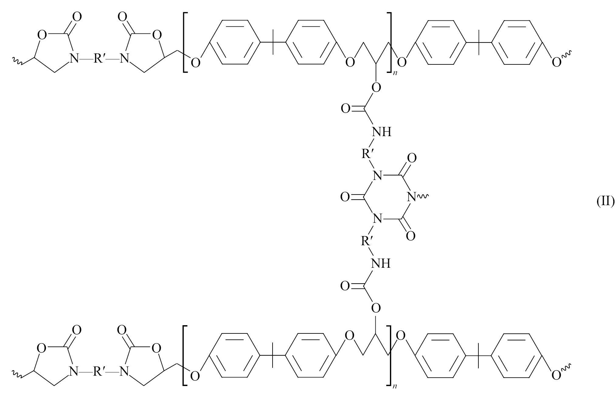 Трехмерное сшивание эпоксиизоцианатного связующего должно происходить в результате тримеризации полиизоцианата и формирования эфирных и уретановых связей, в то время как образование оксазолидоновых колец должно приводить к росту полимерной цепи и увеличению ее жесткости [9]. Структура формирующегося продукта представлена ниже: