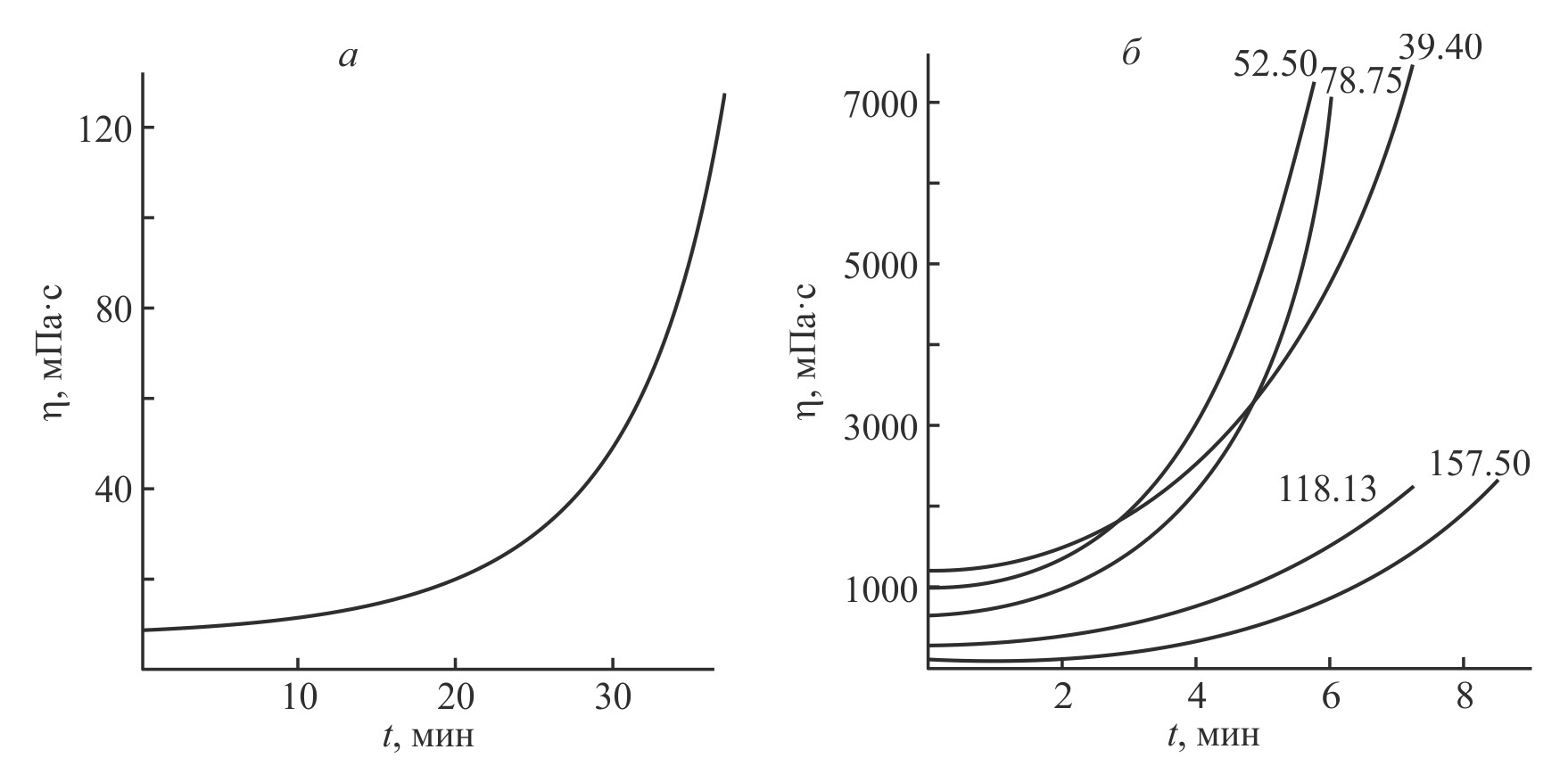 Рис. 3. Зависимости изменения динамической вязкости эпоксиангидридного (110°С) (а) и эпоксиизоцианатных (80°С) (б) связующих от времени отверждения.