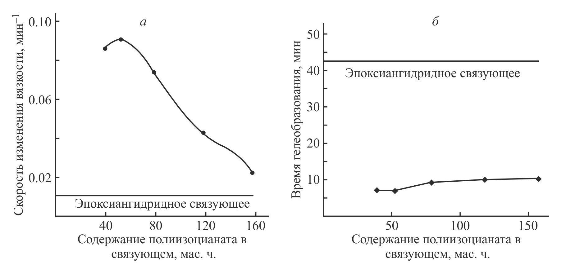 Рис. 4. Зависимости скорости изменения вязкости (а) и времени гелеобразования (б) связующих при температуре отверждения от содержания полиизоцианата.
