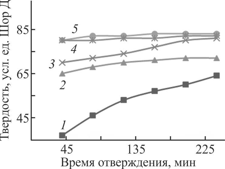 Содержание полиизоцианата в связующем оказывает влияние на изменение твердости нетермостатированных образцов в процессе отверждения материалов (рис. 5). Оценка этого изменения для недоотвержденных образцов целесообразна для определения времени, достаточного для проведения основной стадии отверждения, которое в случае большинства образцов составляет 180 мин. Следует отметить, что независимо от времени отверждения твердость образцов до термостатирования ниже, чем после такой термообработки (табл. 3). Это объясняется тем, что при повышенных температурах происходит формирование трехмерно сшитой структуры, включающей оксазолидоновые фрагменты [7, 16].