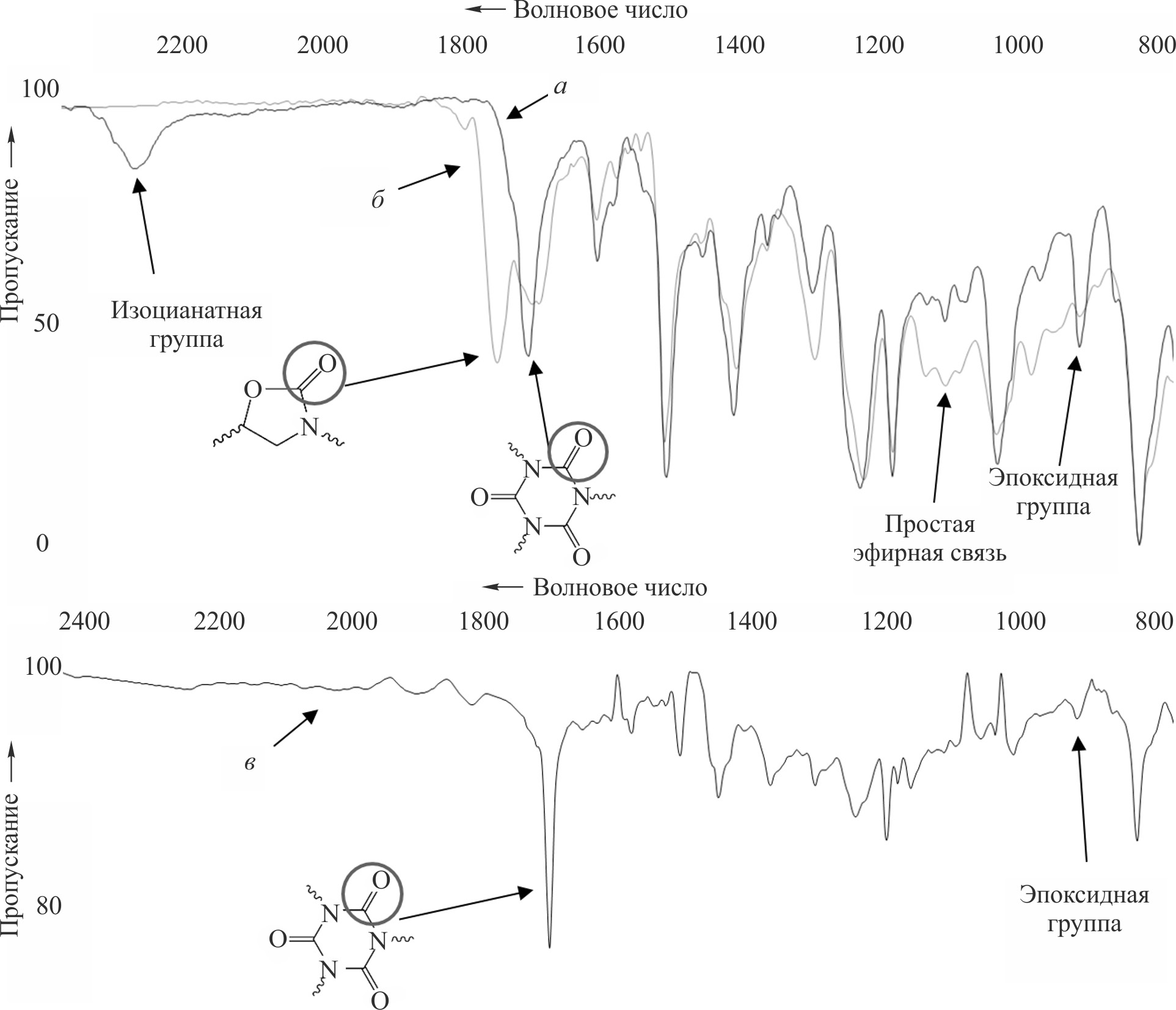 Рис. 6. ИК-спектры эпоксиизоцианатного связующего, содержащего 100 мас. ч. эпоксидиановой смолы марки ЭД-20, 0.1 мас% триэтиламина и 39.4 мас. ч. полиизоцианата, до термостатирования (а), после термостатирования (б) и его золь-фракции (в).