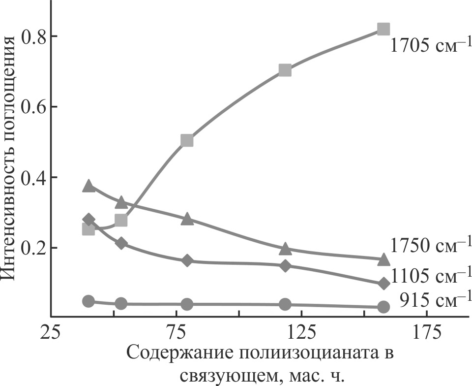 При увеличении доли полиизоцианата в рецептуре связующих наблюдается рост содержания изоцианурата (увеличение интенсивности полосы поглощения в области 1705 см–1, соответствующей колебаниям карбонильной группы изоцианурата, которая перекрывает полосу поглощения, соответствующую колебаниям карбонильной группы уретановой связи, в области 1770–1700 см–1). Наблюдается снижение содержания оксазолидона (уменьшение интенсивности полосы поглощения в области 1750 см–1, соответствующей колебаниям карбонильной группы оксазолидона) и простых эфирных связей (уменьшение интенсивности полосы поглощения в области 1105 см–1, соответствующей колебаниям алифатической простой эфирной связи) в композиции после отверждения (рис. 7). Вместе с тем отвержденные эпоксиизоцианатные связующие содержат остаточные эпоксидные группы (присутствует полоса поглощения в области 915 см–1, соответствующая колебаниям оксиранового кольца) (рис. 7) [9].