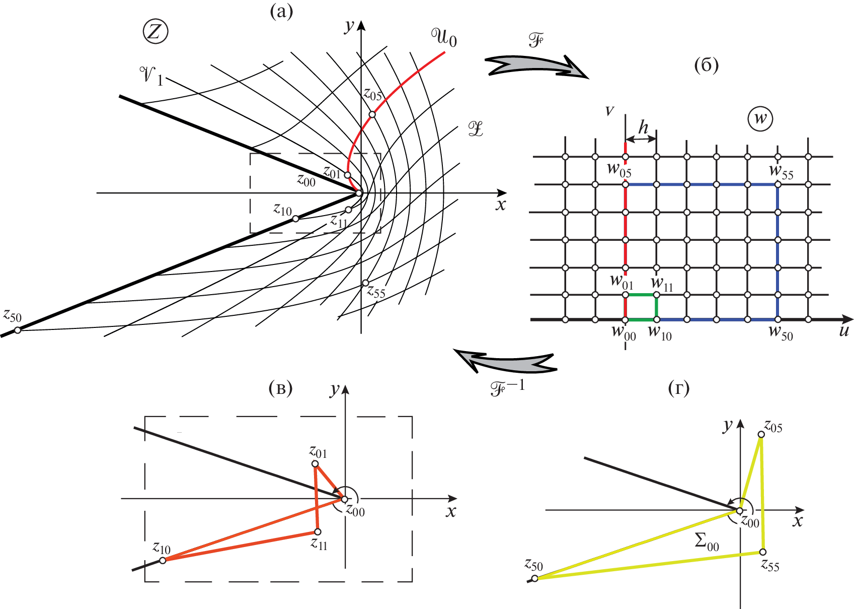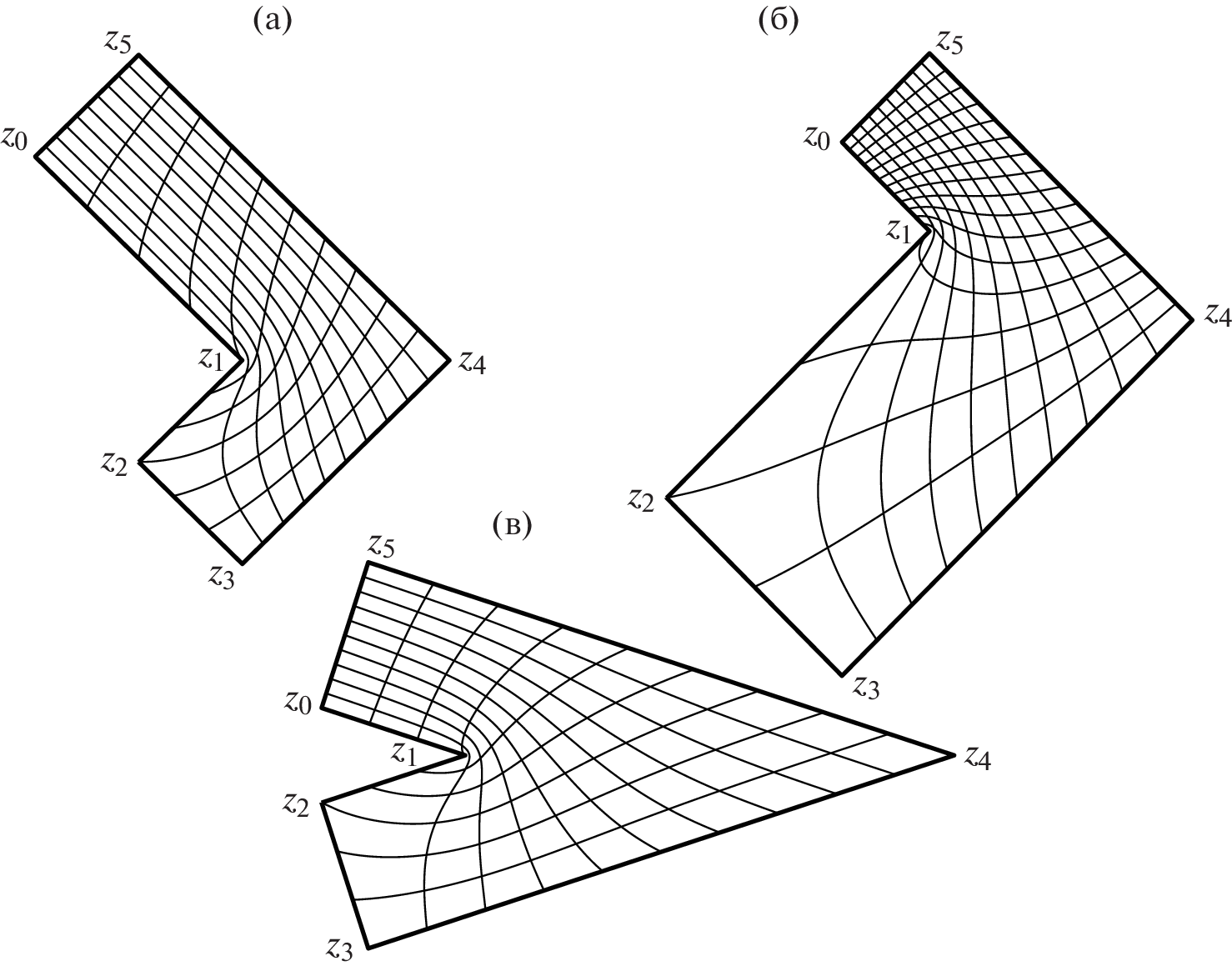 A survey of works concerning difficulties associated with harmonic grid generation in plane domains with angles and cutouts is given, and some new results are presented. It is well known that harmonic grids produced by standard methods in domains with cutouts or reentrant angles (i.e., interior angles greater than π) may contain defects, such as self-overlappings or exit beyond the domain boundary. It is established that, near the vertex of a reentrant angle, these defects follow from the asymptotics constructed for the underlying harmonic mapping, according to which the grid line leaving the angle vertex is tangent to one of the angle sides at the vertex (an effect referred to as “adhesion”), except for a special case. A survey of results is given for domains z of three types with angles or cutouts (L-shaped, horseshoe, and a domain with a rectangular cutout), for which standard methods for harmonic grid generation encounter difficulties. Applying the multipole method to such domains yields a harmonic mapping for them with high accuracy: the a posteriori error estimate of the mapping in the C(z) norm is 10–7 in the case of using 120 approximative functions.