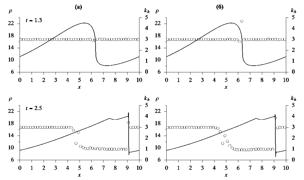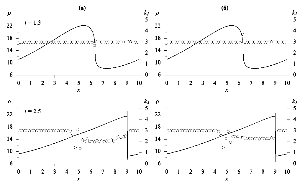Фиг. 2. Плотность газа (сплошные кривые) и порядок интегральной сходимости (кружки) при t = 1.3 и t = 2,5, полученные по бикомпактной схеме (а) и схеме Русанова (б) на сетке с шагом h = 0.01.