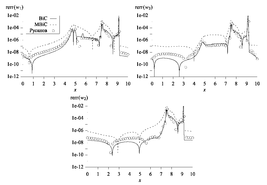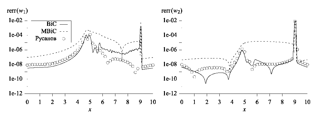На фиг. 6 представлены графики относительных погрешностей инвариантов Римана в момент времени t = 2.5. Перечислим основные отличия от результатов в случае полной системы уравнений газовой динамики (1). Точность вычисления инварианта w1 в области влияния ударной волны для бикомпактной схемы примерно на порядок-полтора хуже, чем для схемы Русанова. Погрешности w1 вне области влияния и погрешности w2 во всей расчетной области для этих схем примерно одинаковы. Разница в точности между бикомпактной схемой и ее монотонизированной версией оказывается еще более глубокой: для инварианта w2 она составляет целых три порядка.