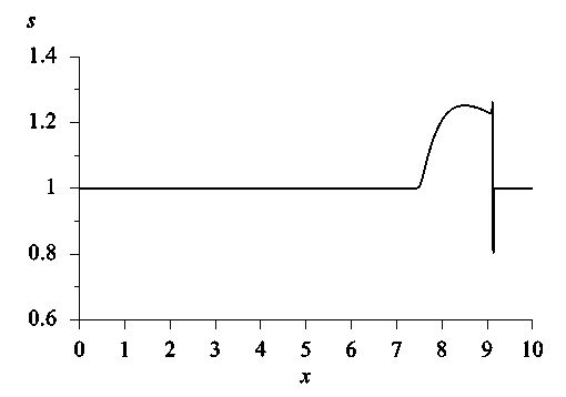 Ясно, что начальные данные (3) представляют собой периодическое гладкое изоэнтропическое течение. С течением времени решение задачи (1), (3) ведет себя как опрокидывающаяся прогрессивная волна. Она движется слева направо (по оси x); те ее участки, где градиенты параметров газа положительны, растягиваются, а те участки, где эти градиенты отрицательны, напротив, сокращаются. Приблизительно в момент времени t = 1.3 происходит градиентная катастрофа и формируются периодические ударные волны, которые затем распространяются с числом Маха, колеблющимся в диапазоне от 1.2 до 1.4. Каждая из ударных волн имеет область влияния, которая примыкает к фронту слева и расширяется.