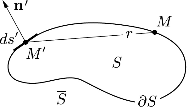 Интегралы берутся по контуру . Контур разбивает плоскость на две области: внутреннюю ограниченную контуром снаружи, и внешнюю ограниченную контуром изнутри, произвольная точка на плоскости, точка интегрирования, элемент дуги в точке , длина контура , вектор нормали к контуру внешней по отношению к , и производные по направлению внешней нормали в точках и соответственно, функция Грина, расстояние между точками и . (Обозначения показаны на фиг. 2).