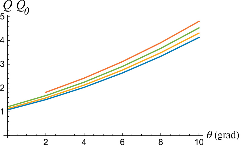 Фиг. 5.Зависимости расхода через сопло от угла атаки, при значениях параметра.