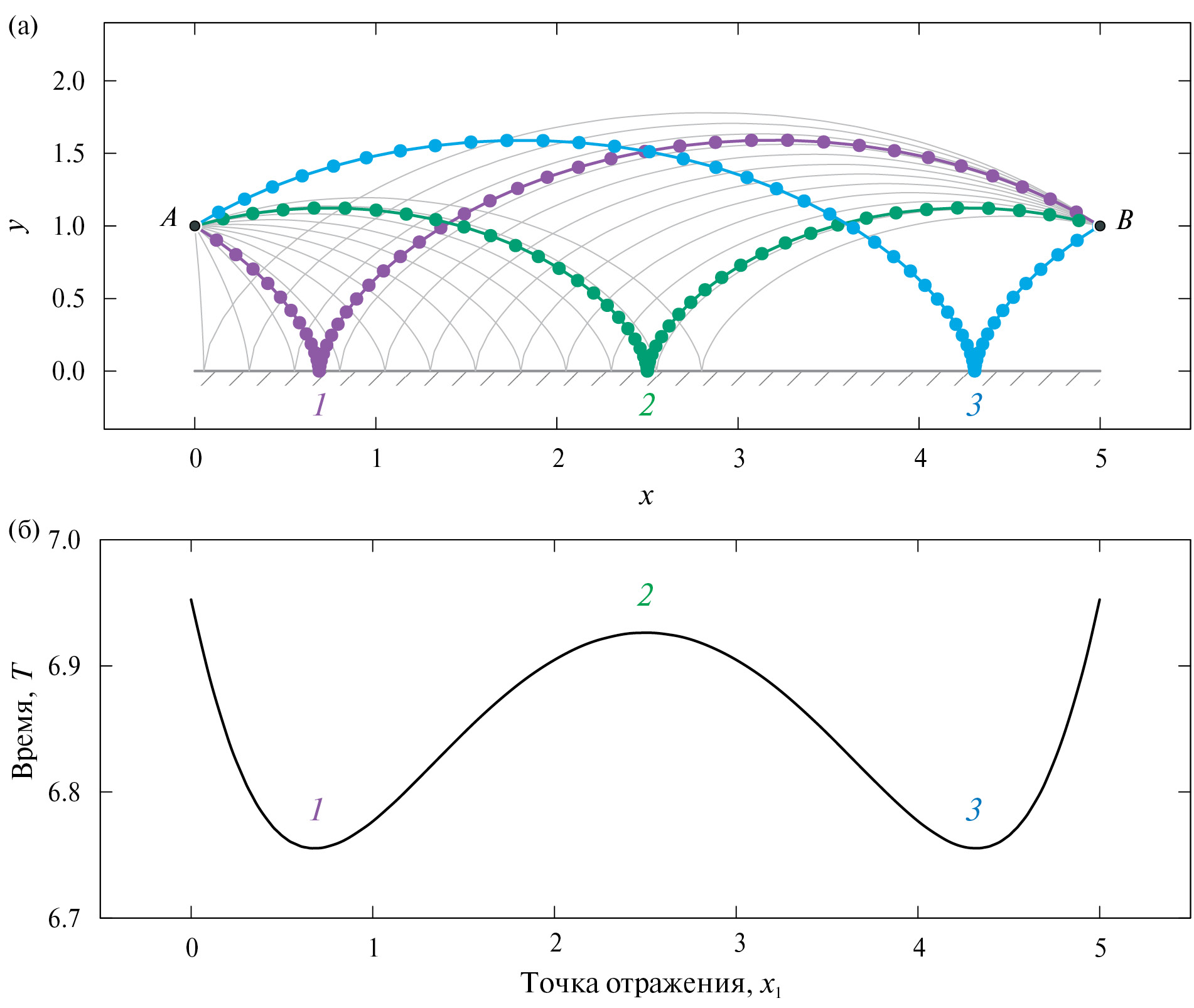 Рассмотрим лучевые траектории с заданными граничными условиями и . В данном случае решениями граничной задачи являются три отраженных луча (см. фиг. 2), соответствующие трем стационарным точкам целевой функции (4). Выполним проверку соответствия полученных лучевых траекторий стационарным точкам целевой функции на основе численной процедуры “экспресс анализа” [15]. Численное исследование функционала (4) основано на понятии “виртуальный луч”. Под термином “виртуальный луч” будем понимать траекторию, разделенную точками отражения на интервалы, где каждый из которых минимизируется независимо. Таким образом, после расчета набора виртуальных лучей для различных положений точки отражения в диапазоне (см. фиг. 2а), была определена функциональная зависимость времени распространения вдоль каждого виртуального луча от положения точки (см. фиг. 2б). Полученная зависимость характеризуется наличием трех экстремумов: локальный минимум 1 (фиг. 2б) и соответствующий ему луч 1 (фиг. 2а), максимум 2 луч 2, локальный минимум 3 луч 3.