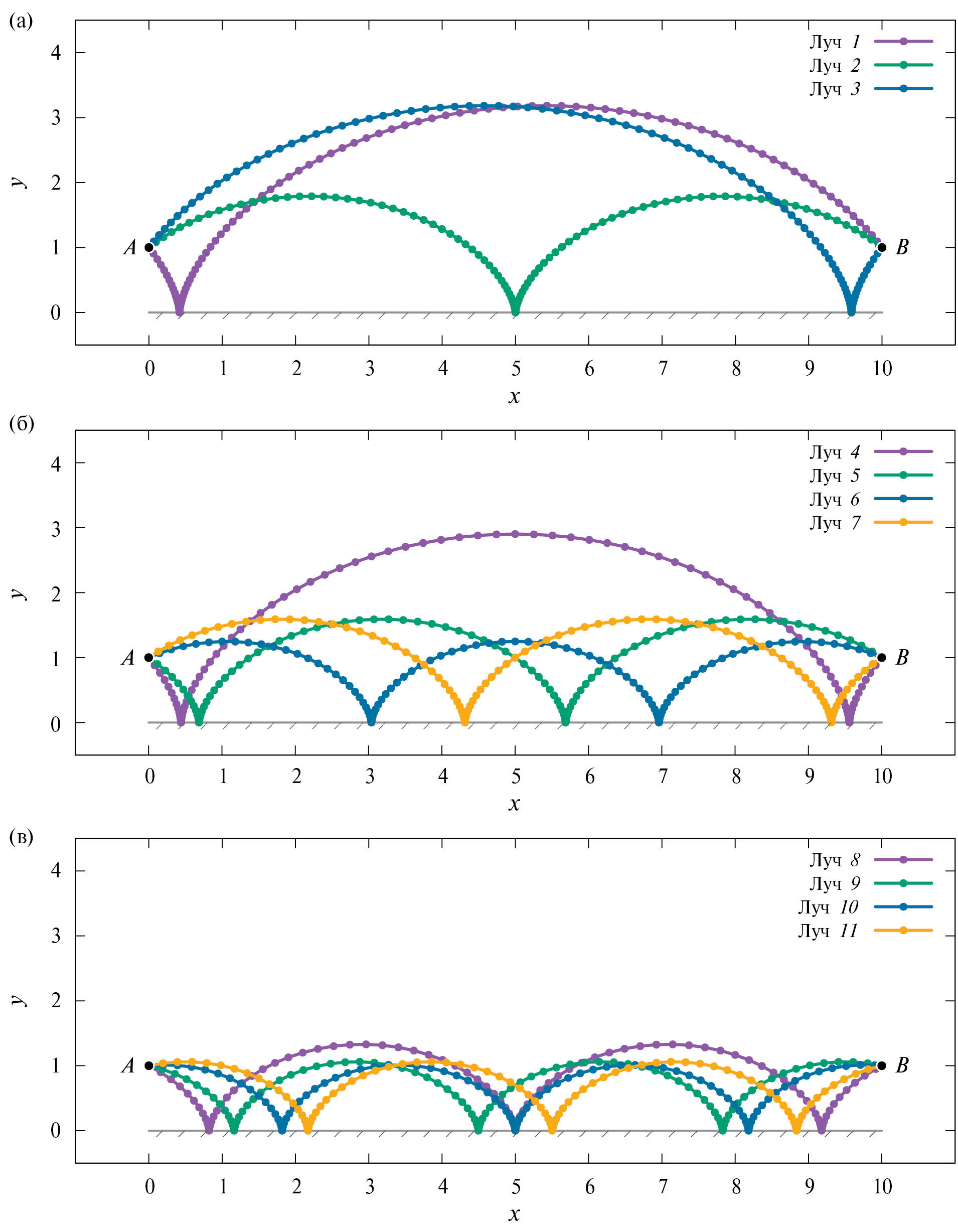 Фиг. 3.аЛучи с одним, бдвумя, втремя отражениями от берега. Решения, полученные вариационным методом, представлены кружками. Аналитические решения представлены сплошными линиями.