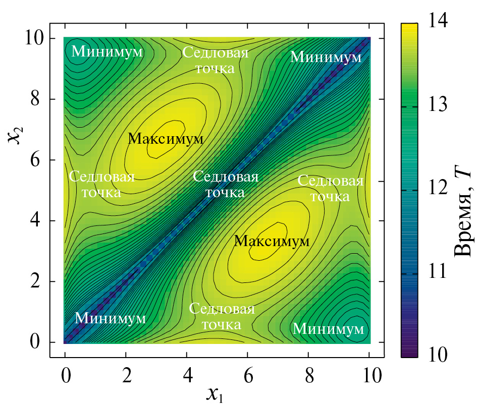 Фиг. 4. Карта зависимости времени распространения вдоль виртуальных лучей от положений двух точек отражения и . Стационарные точки соответствуют лучам 1 – 7 из фиг. 3a, б.