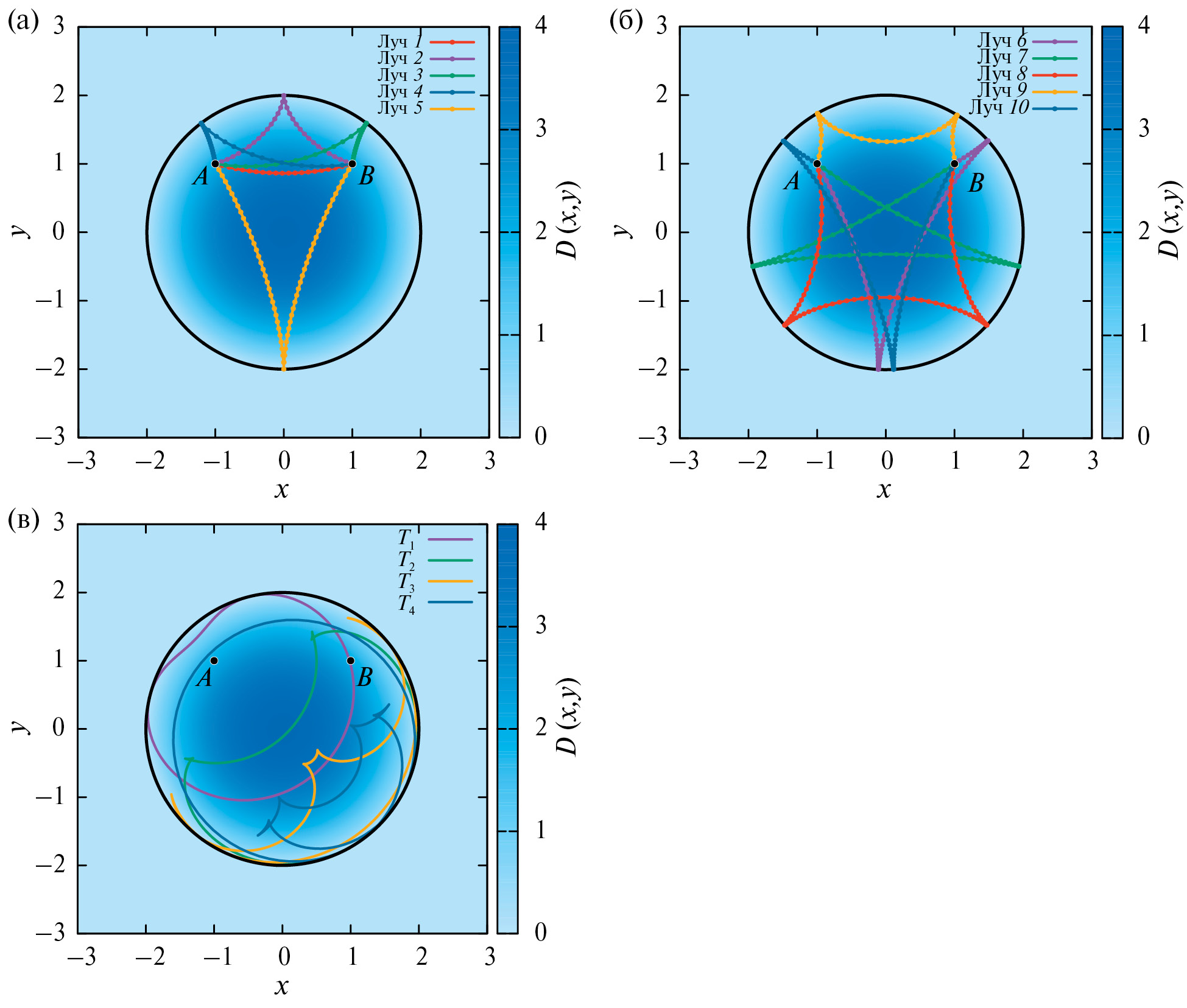 Фиг. 5. Результаты расчетов лучевых траекторий между точками и с одной (а) и двумя (б) точками отражения в круглом бассейне с параболическим дном. Решения, полученные вариационным методом, представлены кружками. Лучевые траектории, рассчитанные методом бихарактеристик, представлены сплошными линиями. (в) Фронты волны, восстановленные на основе лучевых расчетов методом бихарактеристик, для моментов времени – с шагом . Цветовая шкала соответствует распределению функции глубины водоема . Берег, где выполняется условие , представлен сплошной черной кривой.