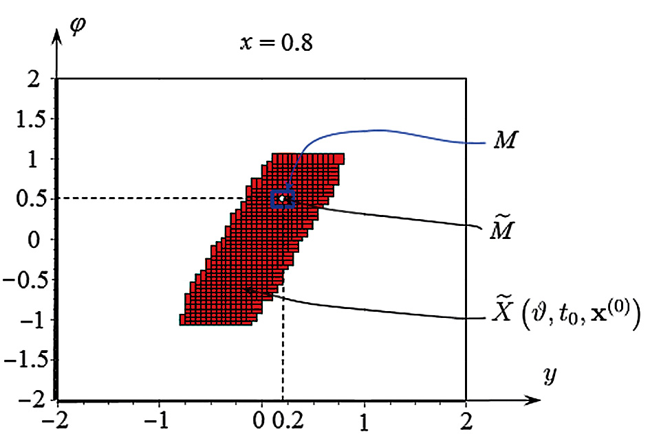 Моделирование движения системы (1) под действием полученного управления с помощью метода РунгеКутты с шагом по времени показало, что состояние системы в момент времени перешло в точку . Величина промаха (в евклидовой метрике) составила , что составляет 2.68 % от длины ребра куба , являющимся ячейкой разбиения множества возможных целевых точек.